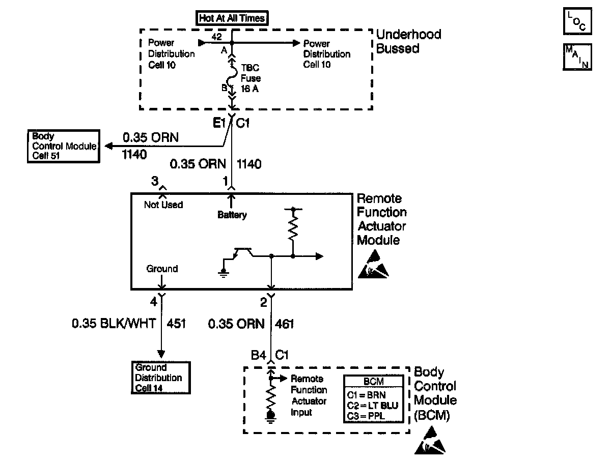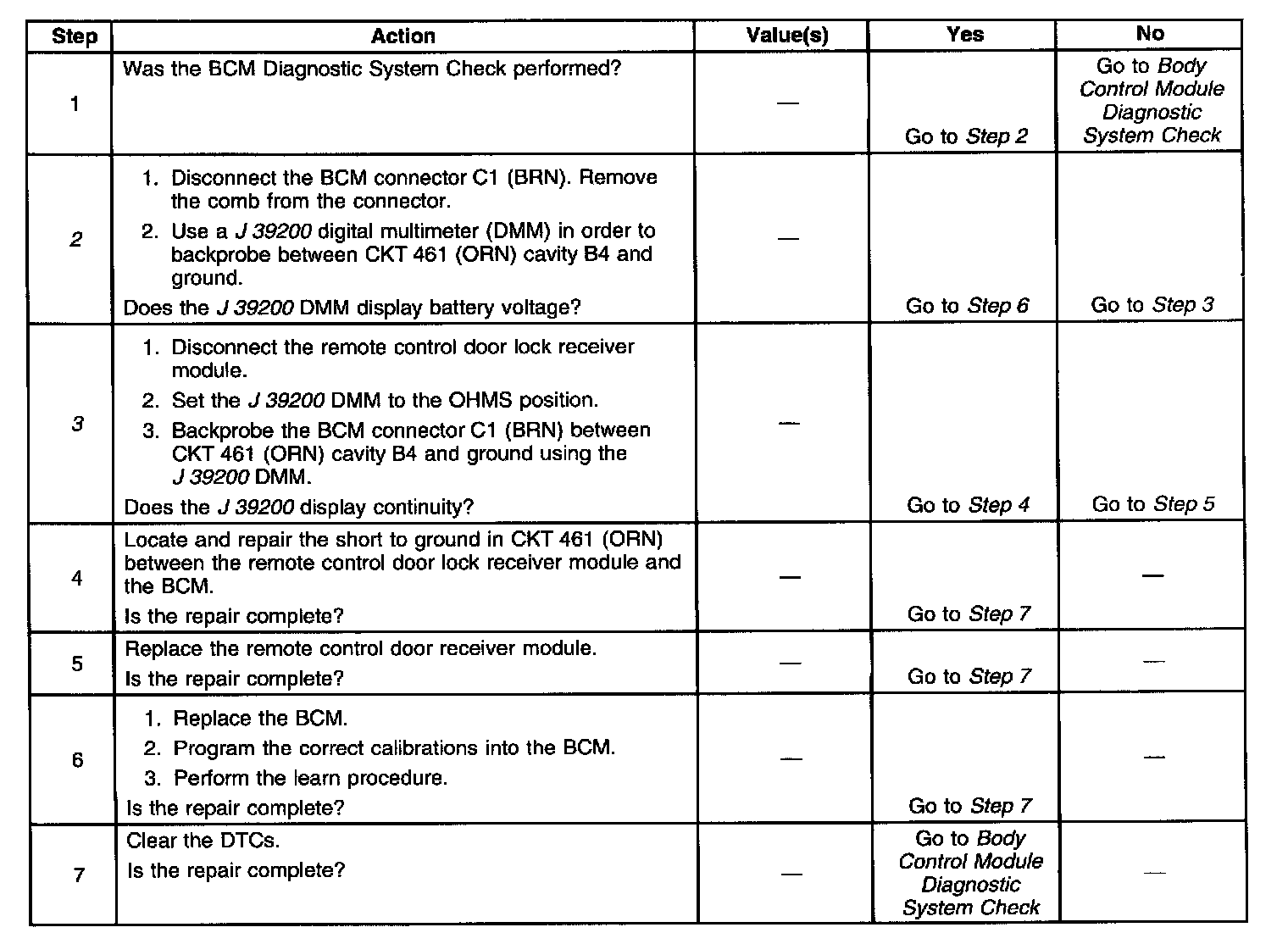 The Body Control Module (BCM) uses CKT 461 in order to receive the command of the remote control door lock receiver module. The command locks and unlocks the doors. When a key fob button is pressed, it transmits a radio frequency signal to the remote control door lock receiver module. The signal is decoded and sent to the BCM on CKT 461. The signal locks or unlocks the doors.