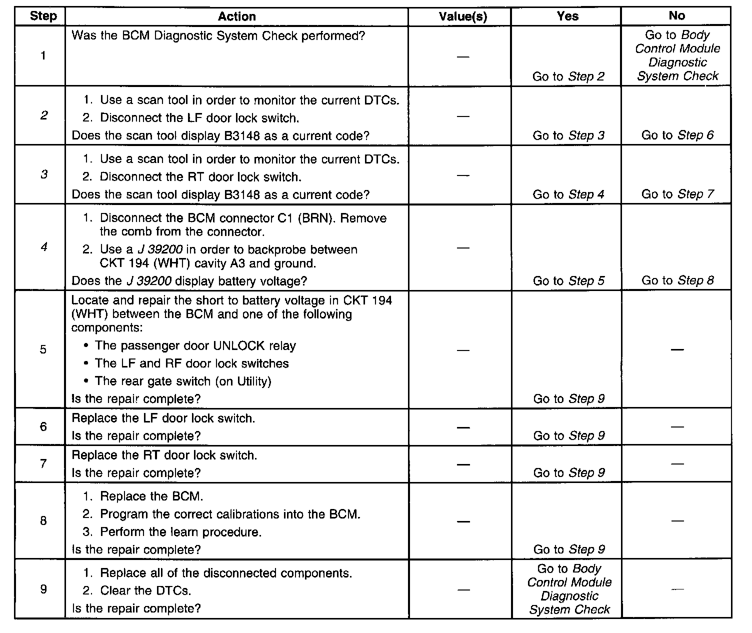 The Body Control Module (BCM) monitors and supplies an output voltage on CKT 194 in order to lock the doors. When the BCM receives an unlock signal from the remote control door lock receiver to unlock the passenger door, the BCM supplies voltage to the unlock relay and unlocks the door. If CKT 194 is shorted to battery voltage for more than 184 seconds, the BCM will set B3148 as a current code.