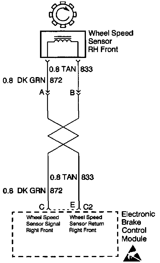 When inspecting a wheel speed sensor, inspect the sensor terminals and the harness connector for corrosion. If evidence of corrosion exists, then replace the wheel speed sensor. Refer to Wheel Speed Sensor Replacement (2WD) or Wheel Speed Sensor Replacement (4WD) or Wheel Speed Sensor Replacement (AWD).