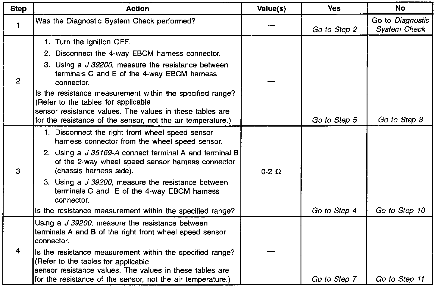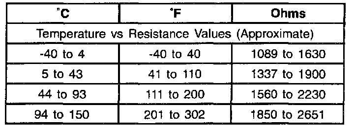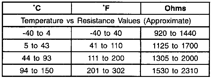 Resistance of the wheel speed sensor will increase with an increase in sensor temperature. Refer to the following tables for temperature/resistance values.