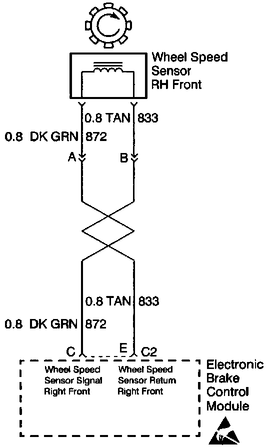 When inspecting a wheel speed sensor, inspect the sensor terminals and the harness connector for corrosion. If evidence of corrosion exists, then replace the wheel speed sensor. Refer to Wheel Speed Sensor Replacement (2WD) or Wheel Speed Sensor Replacement (4WD) or Wheel Speed Sensor Replacement (AWD).