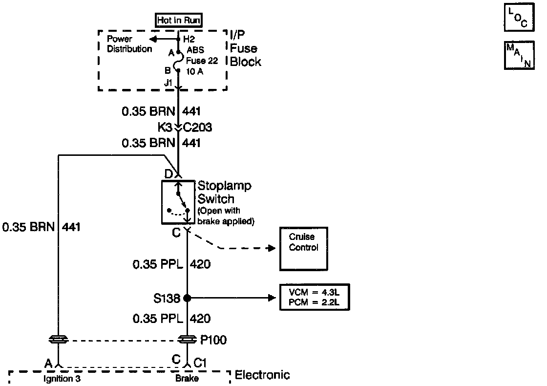 The Stop Lamp Switch is normally closed. With the ignition in the RUN position and the brake pedal not depressed, the Electronic Brake Control Module (EBCM) will have ignition voltage present at terminal C of the 10-way connector. When the brakes are applied, the ignition voltage present at the EBCM will be zero. In a normal braking situation, if the EBCM senses wheel slippage without seeing the brake switch input, it will set a DTC C0281. The ABS indicator lamp will come on and the code will be stored as an ignition latched DTC.