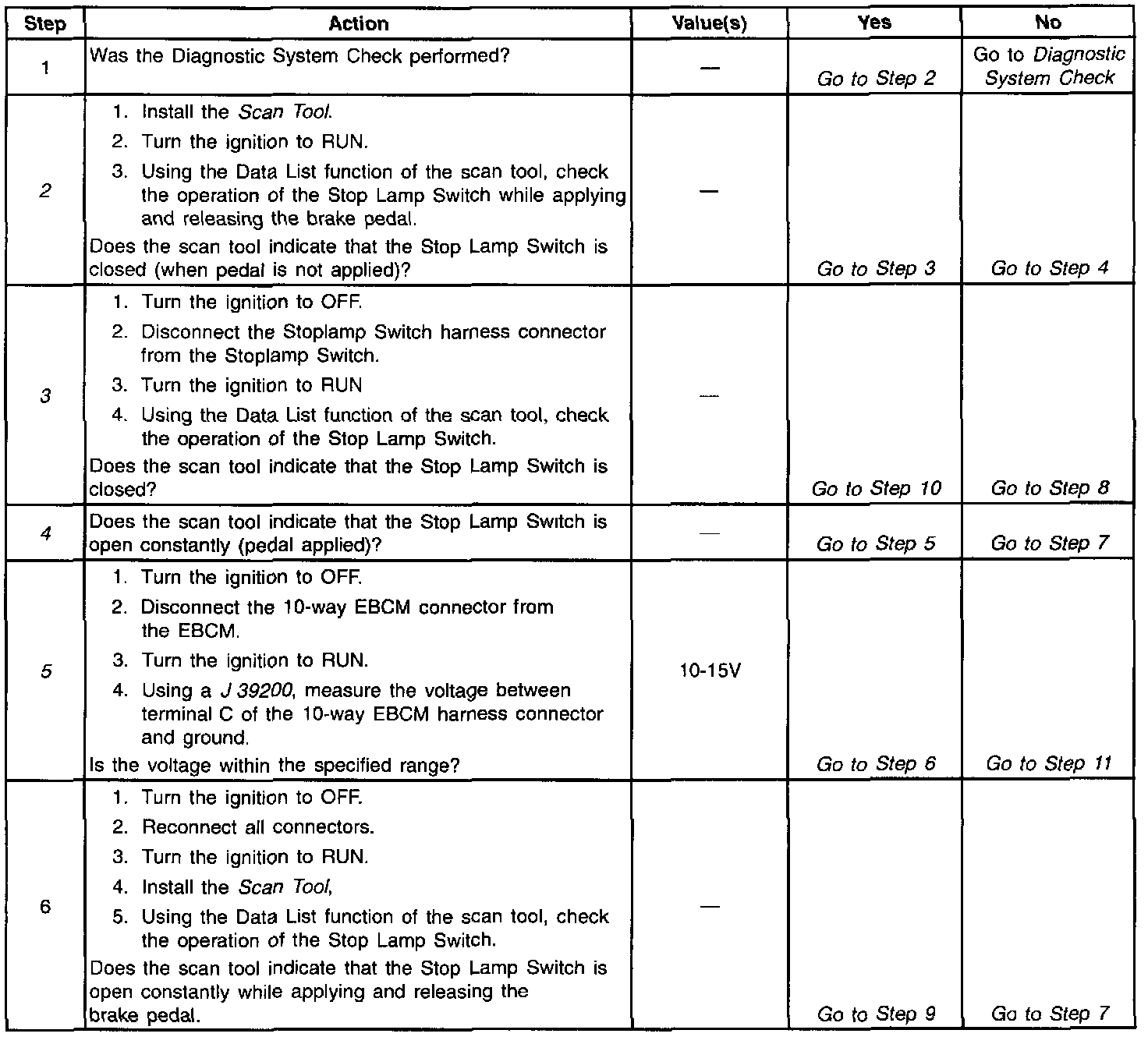 5. This step checks for an open in the Stop Lamp Switch circuit between the Stoplamp Switch and the EBCM.
