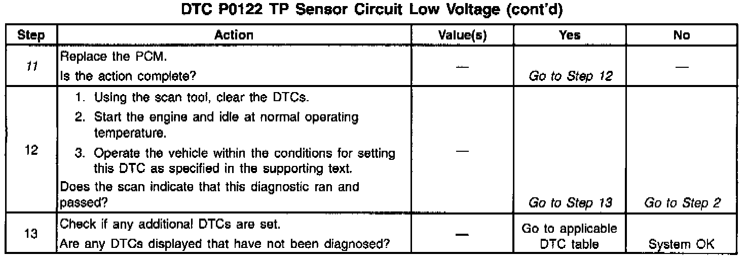 A faulty A/C sensor could set a DTC P0122. Disconnect the A/C electrical connector. If the TP reading returns to normal, replace the A/C Refrigerant Sensor.