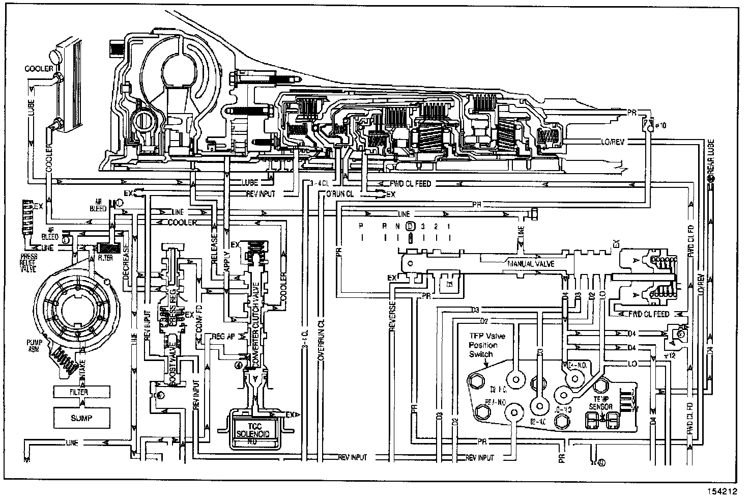 The flow of transmission fluid starts in the bottom pan and is drawn through the filter, control valve body assembly, transmission case and into the oil pump assembly. The oil pump assembly pressurizes the fluid and directs it to the pressure regulator valve where it becomes the main supply of fluid to the various components and hydraulic circuits in the transmission. Hot fluid exiting the torque converter flows through the converter clutch apply valve and into the transmission cooler lines to the oil cooler located in the vehicle radiator (and auxiliary cooler if equipped). From the cooler, fluid returns to cool and lubricate the front of the transmission. In forward drive ranges, D4 fluid from the manual valve is routed through an orificed cup plug in the rear of the transmission case to feed the rear lube fluid circuit.