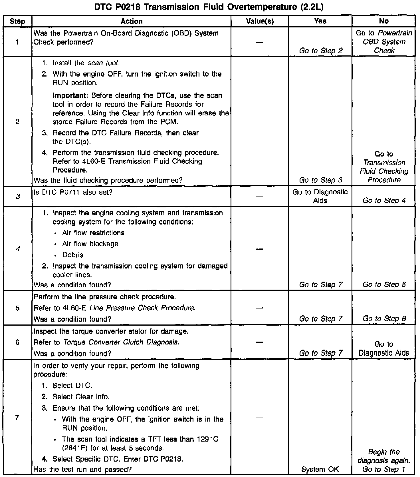 ^ DTC P0218 may set approximately 600 seconds after DTC P0711 has set. If DTC P0711 is also set, follow the diagnostic table for DTC P0711 before proceeding to the diagnostic table for DTC P0218. Repairing the condition that caused DTC P0711 will likely eliminate DTC P0218.