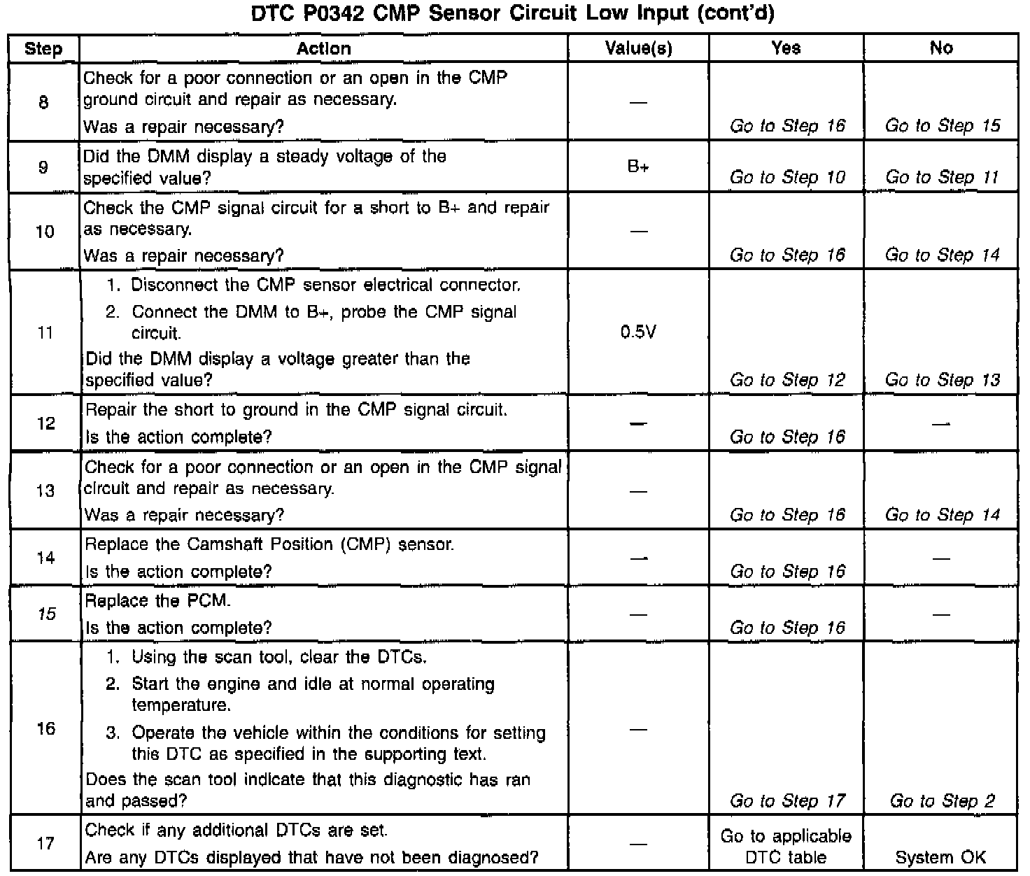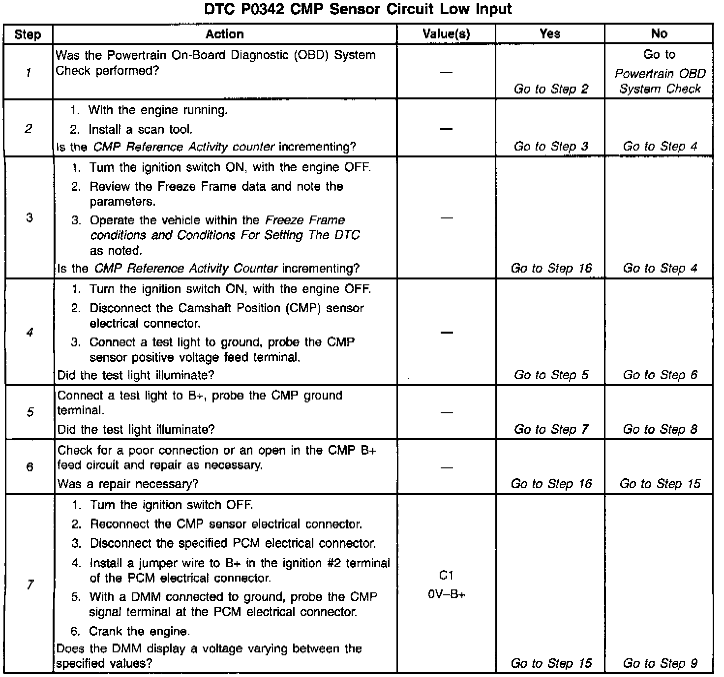 7. This step checks for a signal from the CMP sensor. It is necessary to supply B+ to the ignition positive #2 terminal in order for the CMP sensor to have 8+ supplied to it. While cranking the engine, the CMP sensor will send a 8+ signal and then a ground signal as the reluctor passes the sensor.