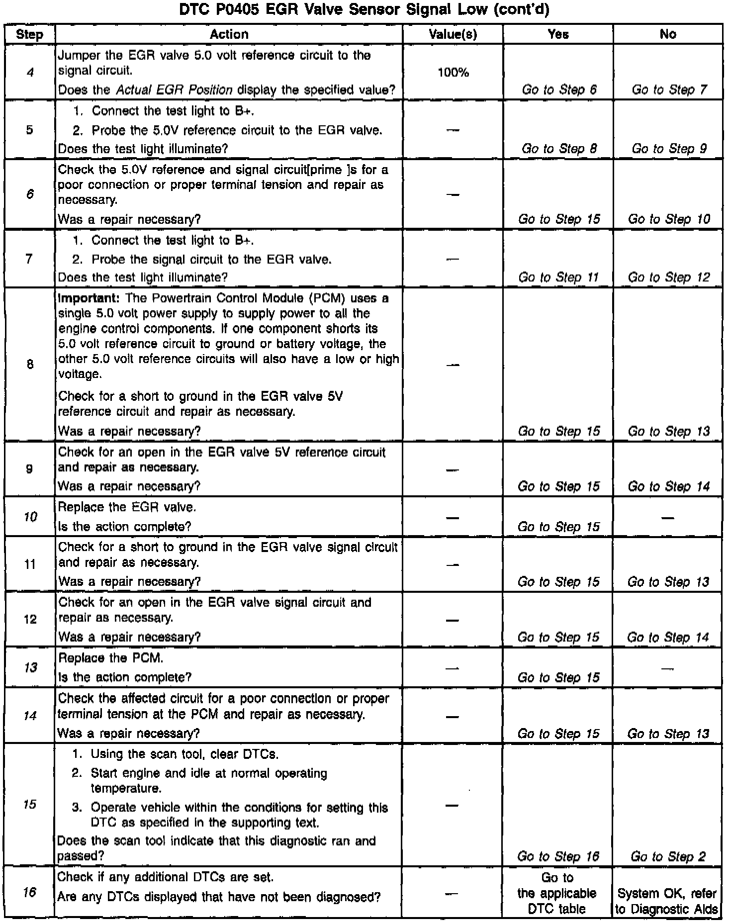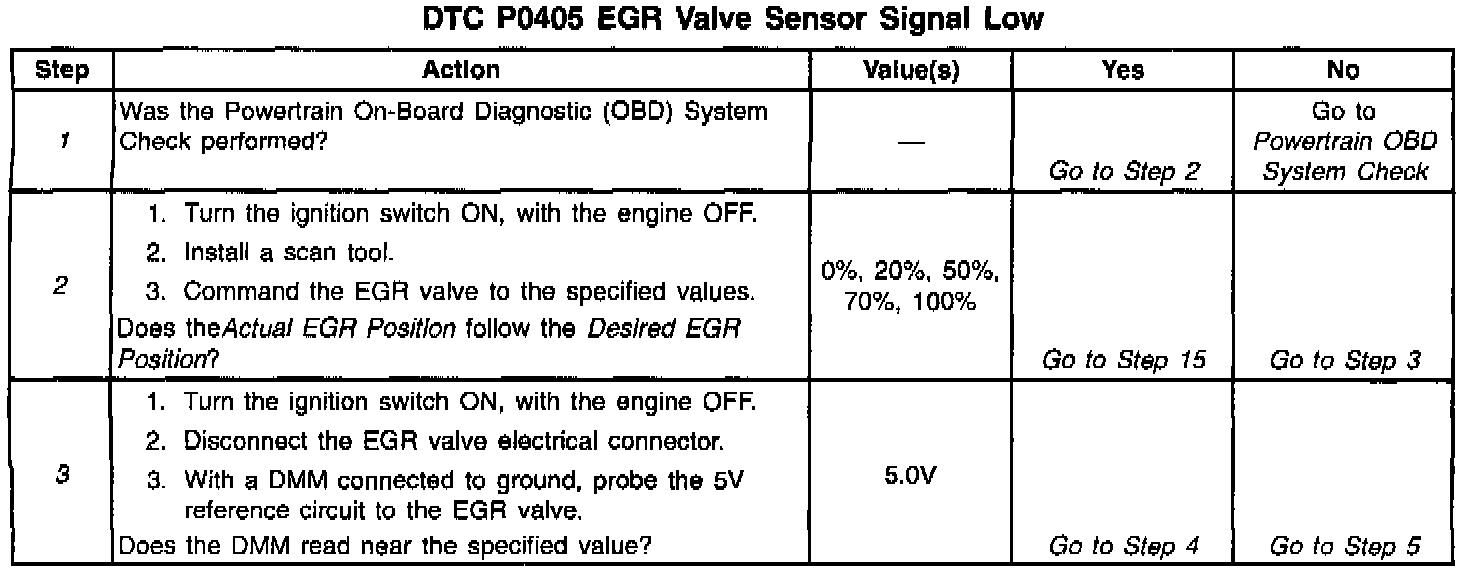 3. If the EGR valve 5.0 volt reference is shorted to ground, the Digital Multimeter (DMM) will read no voltage and an additional DTC will be set and engine performance will be poor. When this circuit is open, only a DTC P0405 will be set.