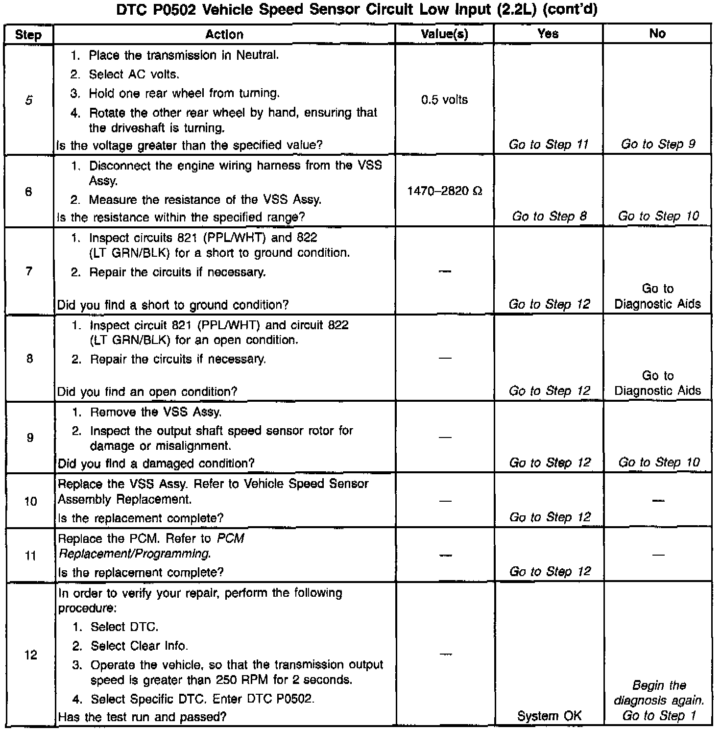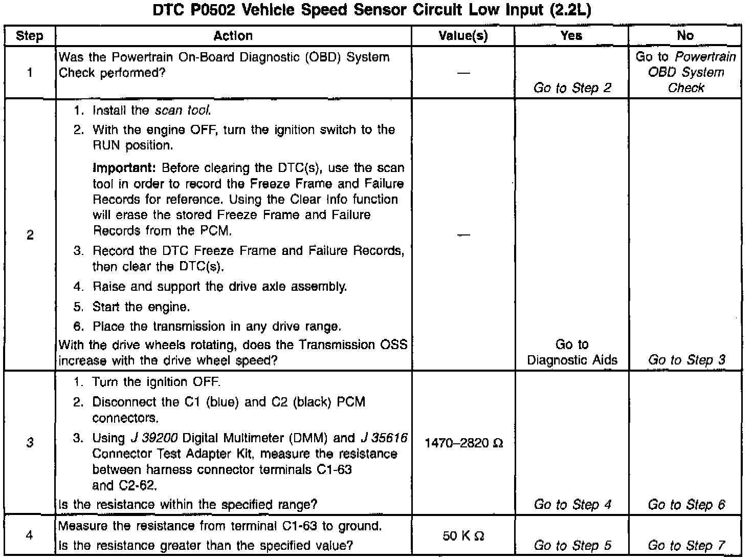 When the PCM detects a low vehicle speed when there is a high engine speed in a drive gear range, then DTC P0502 sets. DTC P0502 is a type B DTC.