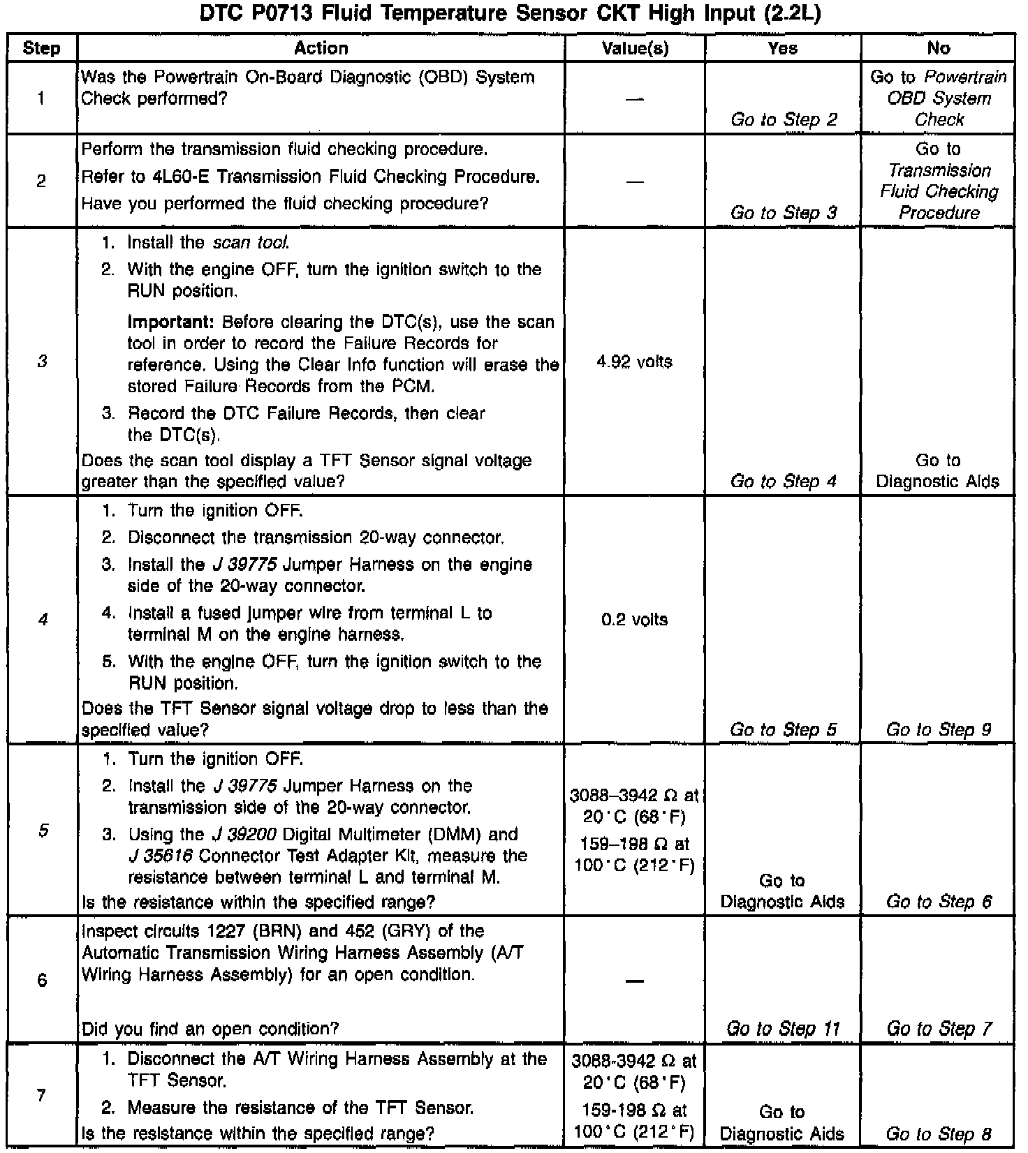 ^ Use the Temperature vs Resistance table when testing the TFT Sensor at various temperature levels. Test the TFT Sensor in order to evaluate the possibility of a skewed (mis-scaled) sensor. A skewed sensor can result in delayed garage shifts or Torque Converter Clutch (TCC) complaints.