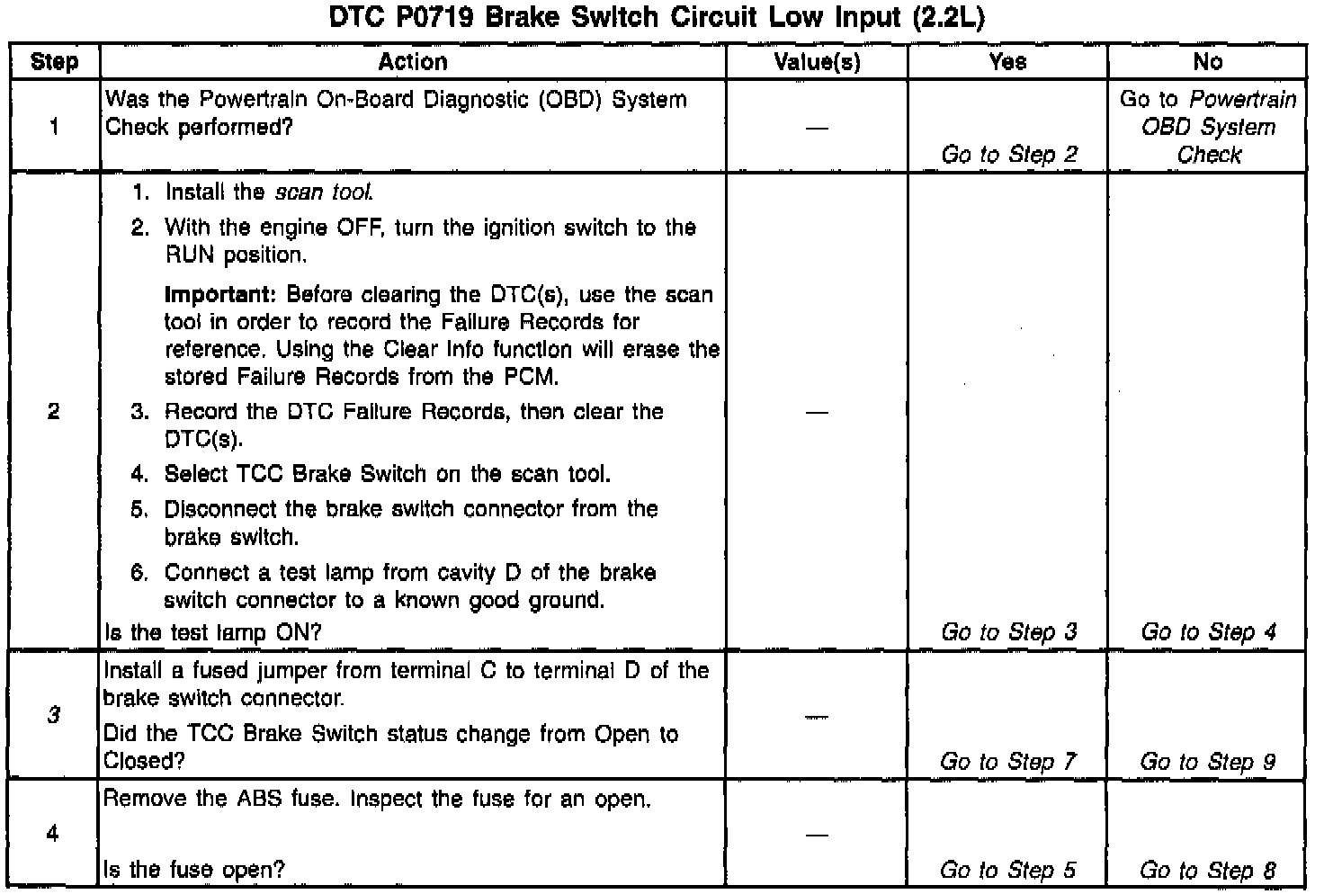 When the PCM detects an open brake switch circuit (0 volts, low input) during accelerations, then DTC P0719 sets. DTC P0719 is a type D DTC.