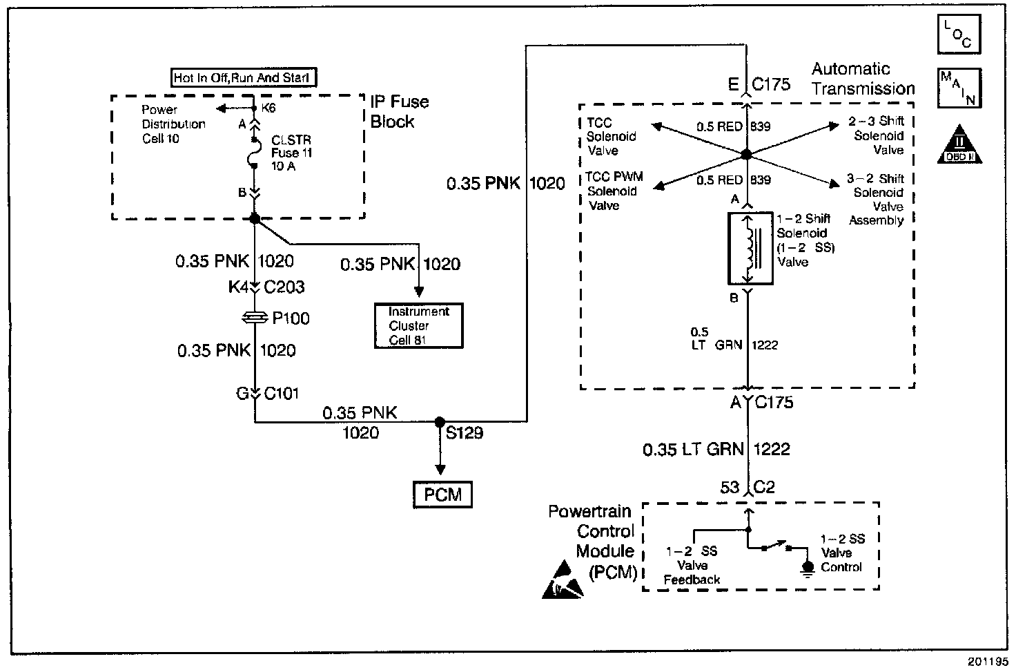 The 1-2 Shift Solenoid Valve (1-2 SS Valve) controls the fluid flow acting on the 1-2 and 3-4 shift valves. The 1-2 SS Valve is a normally-open exhaust valve that is used with the 2-3 Shift Solenoid Valve in order to allow four different shifting combinations. The solenoid attaches to the control valve body within the transmission. The 1-2 SS Valve receives ignition voltage through circuit 1020. The Powertrain Control Module (PCM) controls the solenoid by providing the ground path on circuit 1222.