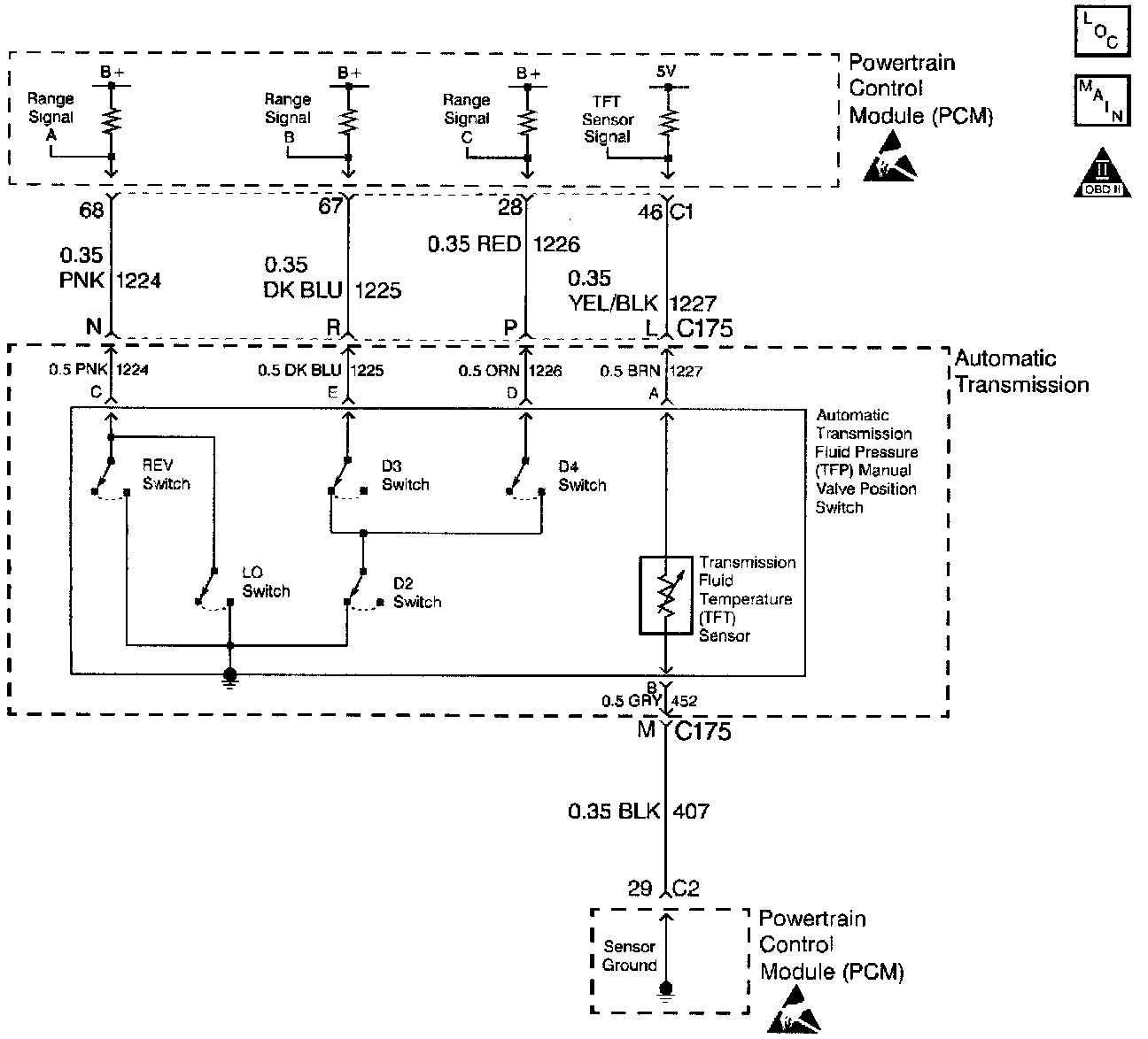The Powertrain Control Module (PCM) supplies the battery voltage for each range signal. By grounding one or more of the circuits through various combinations of the pressure switches, the PCM detects which manual valve position you select. The PCM compares the actual voltage combination of the switches to a Transmission Fluid Pressure (TFP) Val. Position Sw. combination table stored in memory.