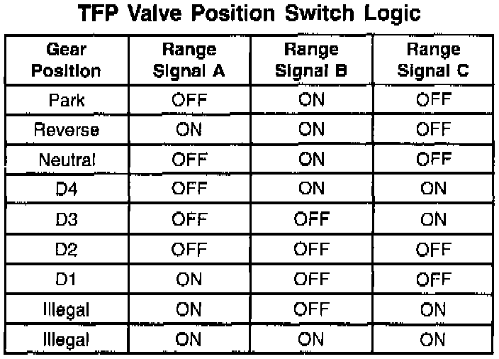 ^ Refer to the TFP Valve Position Switch Logic table for the normal range signals and the illegal combinations. On the table, ON is 0 volts, OFF is B+.