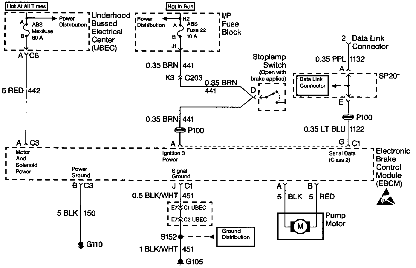 Serial data is transmitted/received by the Electronic Brake Control Module (EBCM) through the 10-way connector at terminal G. The EBCM is supplied switched ignition voltage through the 10-way connector at terminal A, and ground is provided through the 10-way connector at terminal J.