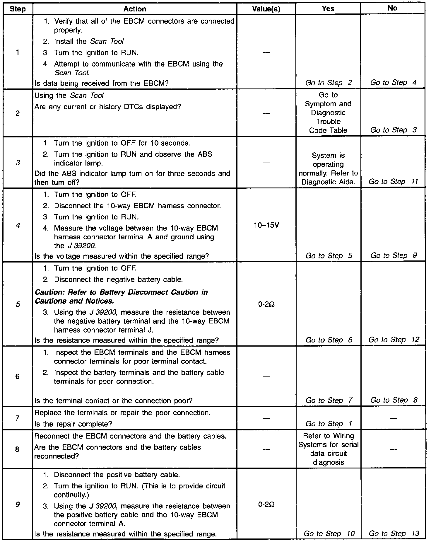 Excessive resistance in the ground or power supply circuits will not allow communication with the EBCM. If communication with the EBCM is not possible, ensure that the ABS ground connection is good and that there is no excessive resistance in any of the power supply circuits.