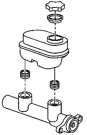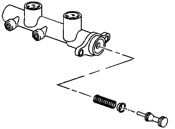 DISASSEMBLY PROCEDURENOTICE: Do not hone the master cylinder bore. When the brake master cylinder is overhauled, it is recommended that the cylinder body be replaced rather than CLEANED UP by honing the bore. The master cylinder has a hard, highly polished BEARINGIZED surface, which is produced by diamond boring followed by ball or roller burnishing under heavy pressure. Honing will destroy this hard smooth surface and cause rapid wear of the rubber cups.