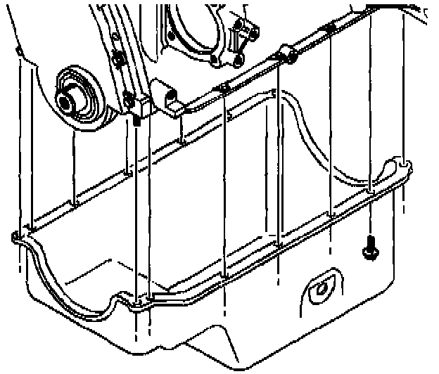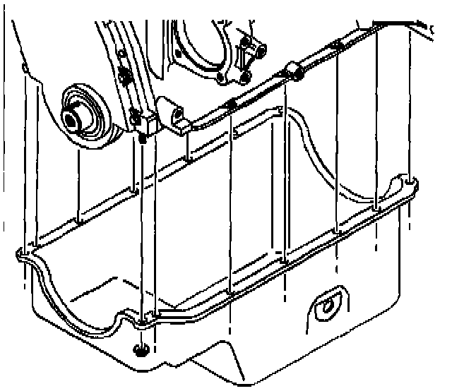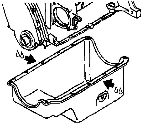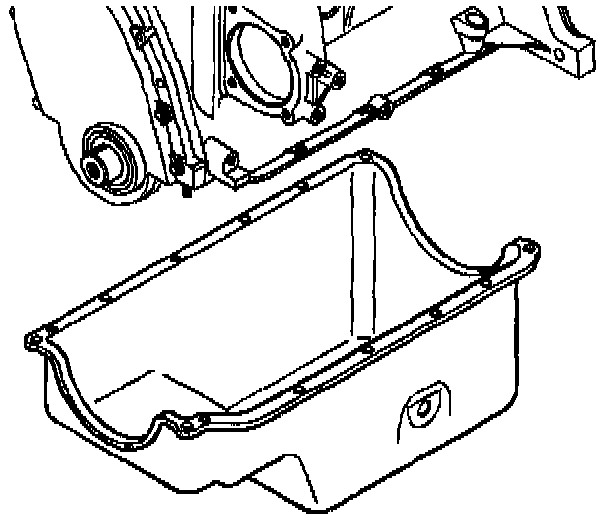 1. Apply a 5 mm (0.193 inch) diameter bead of GM P/N 12346286 Loctite 5900 RTV sealer or equivalent to the oil pan side sealing flanges.