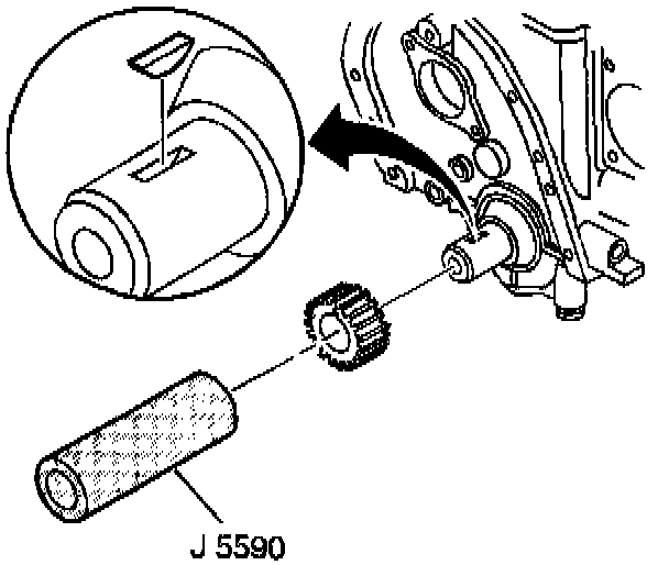 2. Install the crankshaft sprocket with the timing mark facing away from the engine, using J 5590 and a hammer.