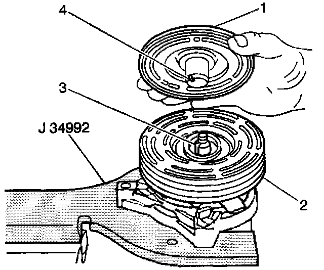 4. Place the clutch plate and the hub assembly (1) onto the compressor shaft.