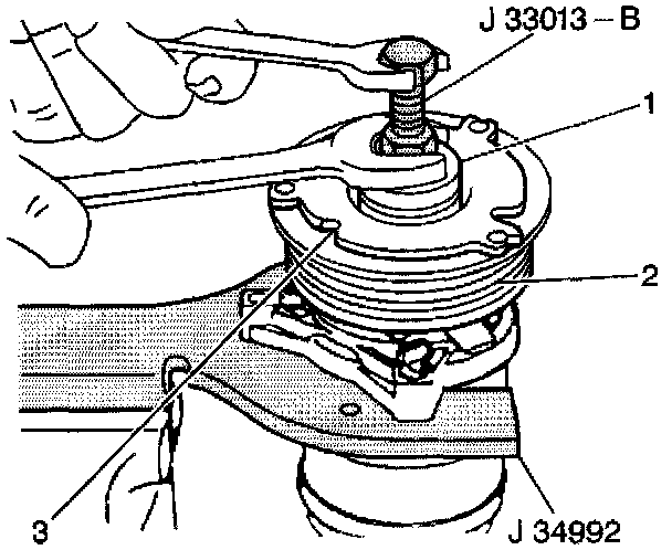 Notice: Do not drive or pound on the clutch hub or shaft. Internal damage to the compressor may result. The forcing tip on the J 33013-B remover/installer center screw must be flat or the end of the shaft/axial plate assembly will be damaged.
