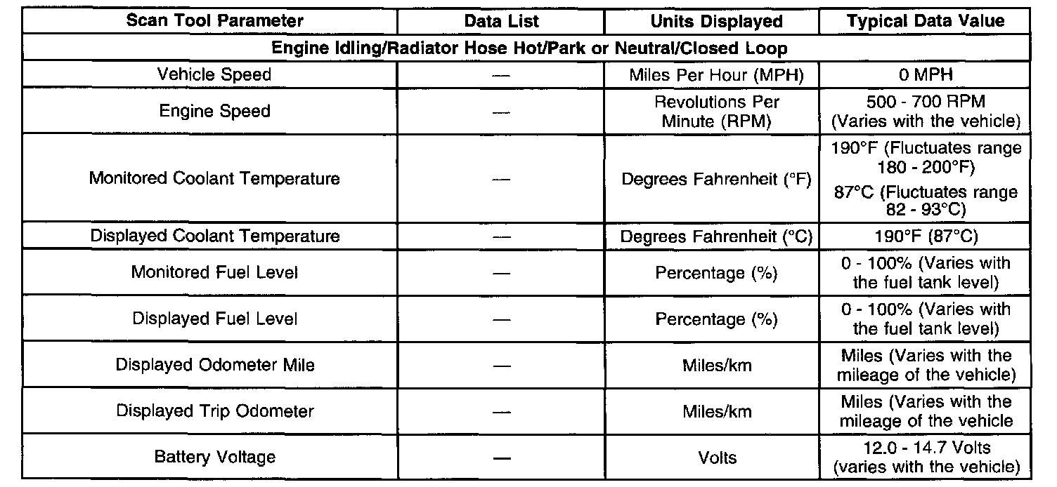 This data is the cluster is measurement of the engine coolant temperature. The data is provided by the VCM/PCM on the Class 2 serial data line. If a Class 2 communication failure occurs, this data will be -40°F (-40°C).