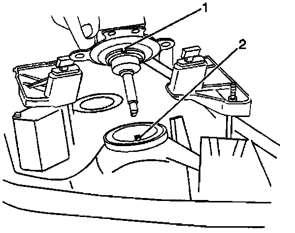 2. Install the headlamp starter assembly to the headlamp. Ensure that the alignment notch (1) and tab (2) are lined up.