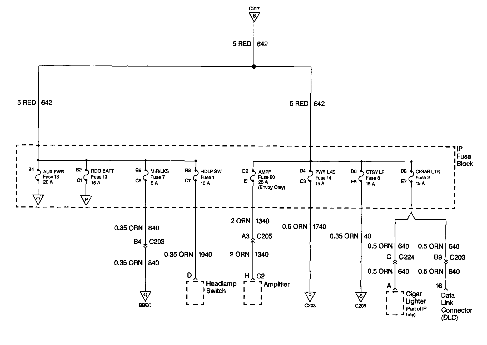 Power Distribution Schematics: AUX PWR, RDO BATT, MIR/LKS, HDLP SW, AMPF, PWR LKS, CTSY LP And CIGAR LTR Fuses: