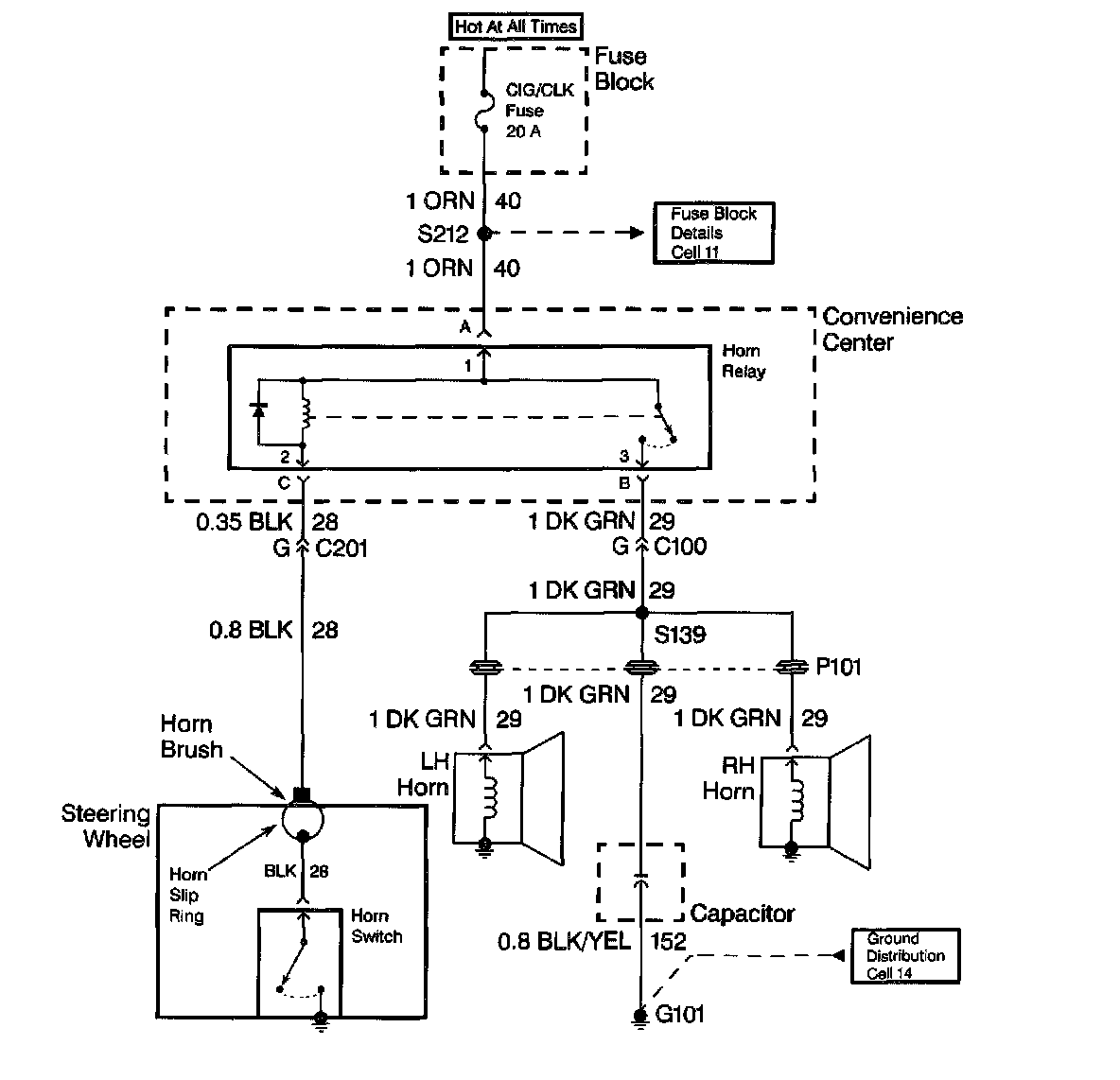 When diagnosing a horn problem use the service information located in the Horns service category. The following schematic is a typical example of a schematic with its supporting text.