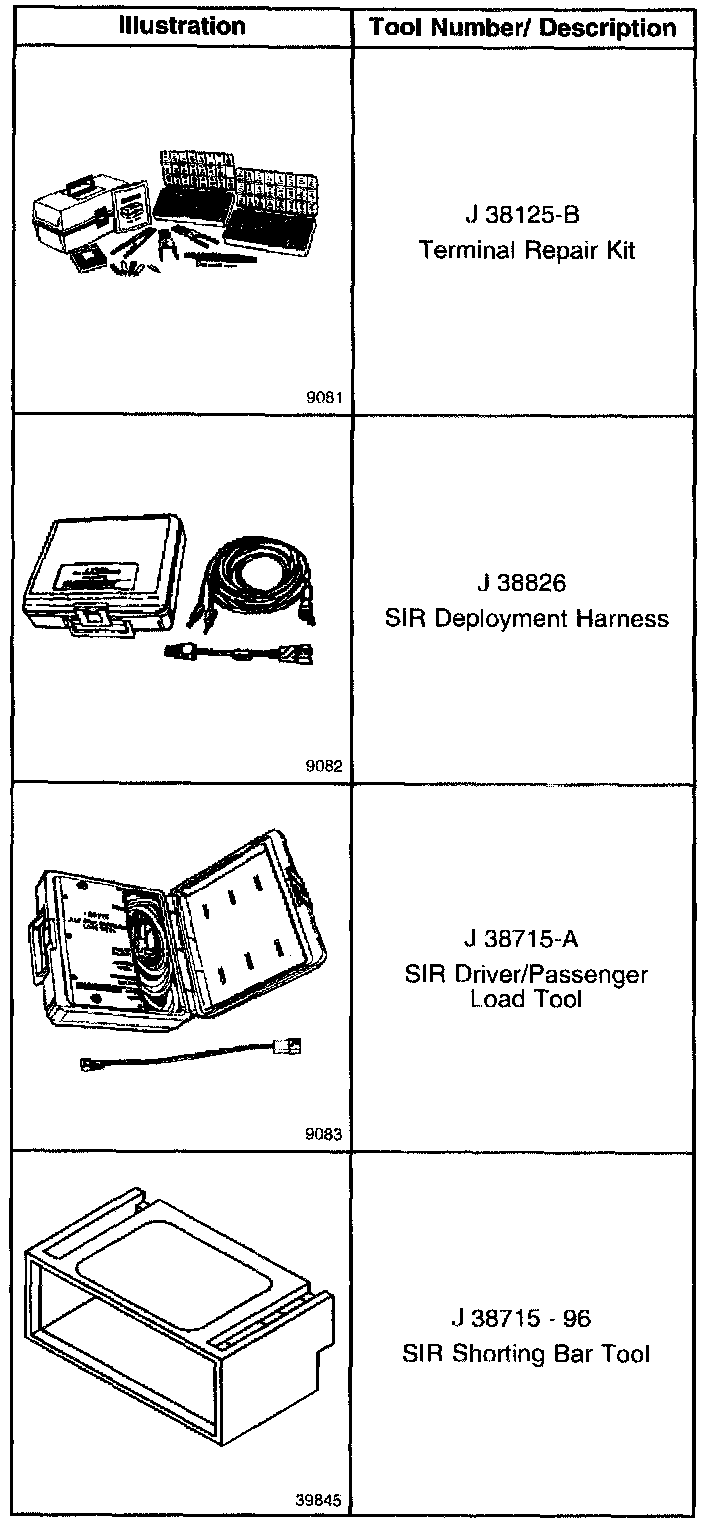 Use the J 38125-B Terminal Repair Kit for SIR wiring repair. This kit contains a special crimping tool heat torch, and sealed splices. Do not use the terminals in the kit in order to replace damaged SIR system terminals unless specifically indicated by the terminal package.