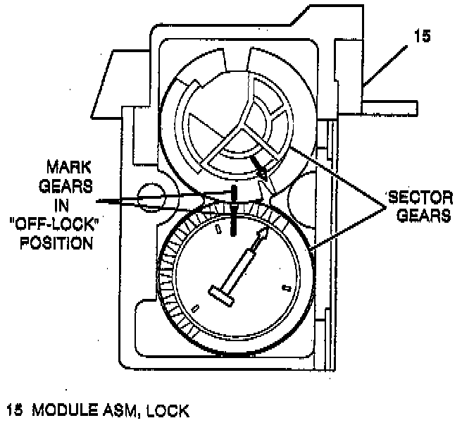 1. Align marks made on sector gears and install sector gears and backing plate to lock module assembly (15). (See the figure for proper timing of gears)