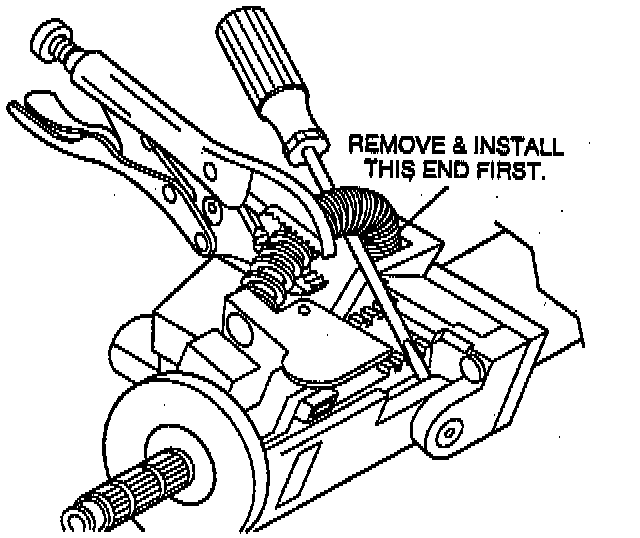 B. Secure spring (20) with locking pliers and continue prying until spring disengages from post on steering column support assembly (57) and steering column tilt head assembly (26).