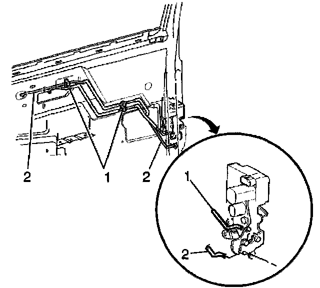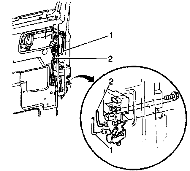 8. Remove the outside door handle rod (2) from the lock assembly.