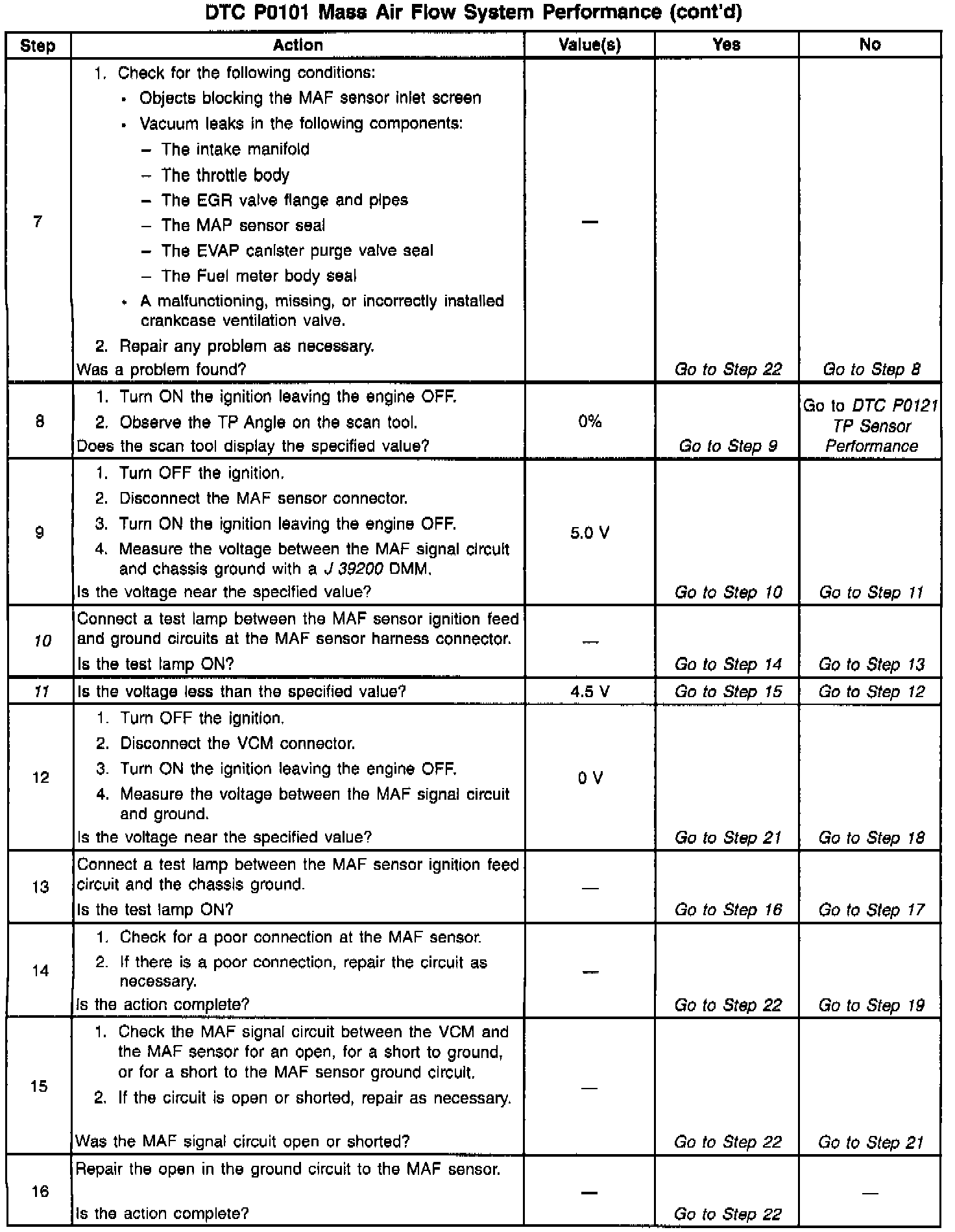 2. The MAP system performance or rationality diagnostic uses the MAP sensor signal along with other inputs in order to calculate an expected airflow rate. The VCM then compares the expected flow rate to the actual measured airflow from the MAP sensor. The first few steps of this table verify that the MAP sensor is working properly. Correct any MAP sensor DTCs first. The value shown for the MAP sensor varies with altitude. The value decreases by approximately 3.0 kPa for every 1000 feet of altitude. 100 kPa is the approximate value displayed at or near sea level.