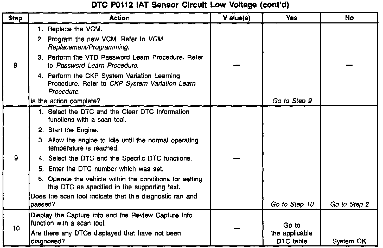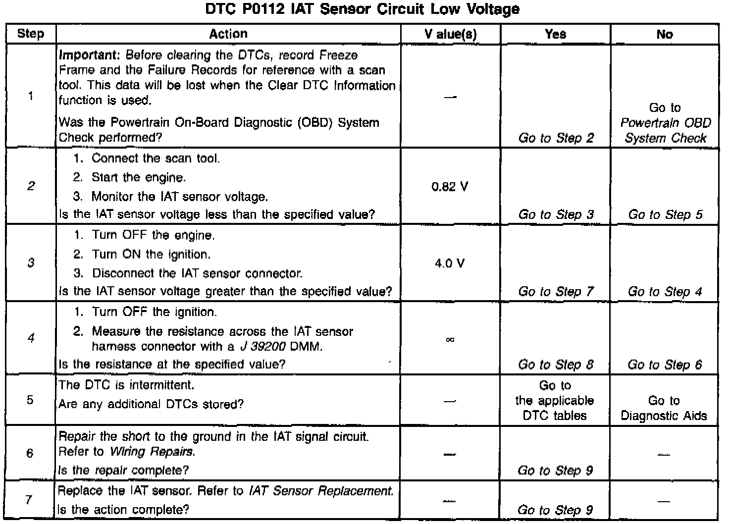 A scan tool indicates the temperature of the ambient air entering the throttle body. The air temperature should read very close to the temperature of the outside air. The air temperature should rise gradually as the engine warms up and the underhood temperature increases. If DTC P1112 is set, the problem is intermittent. Check for a short to ground in the IAT sensor signal circuit. This may be accomplished by moving the VCM harness at various locations and monitoring the IAT temperature or the IAT voltage on the scan tool. If the voltage varies, look for a short to ground in the area of the harness that caused the variance. Also, a sensor may become skewed or mis-scaled. The Temperature vs. Resistance Value Table will help to detect a skewed sensor. Refer to Specifications / Electrical / Temperature vs Resistance.
