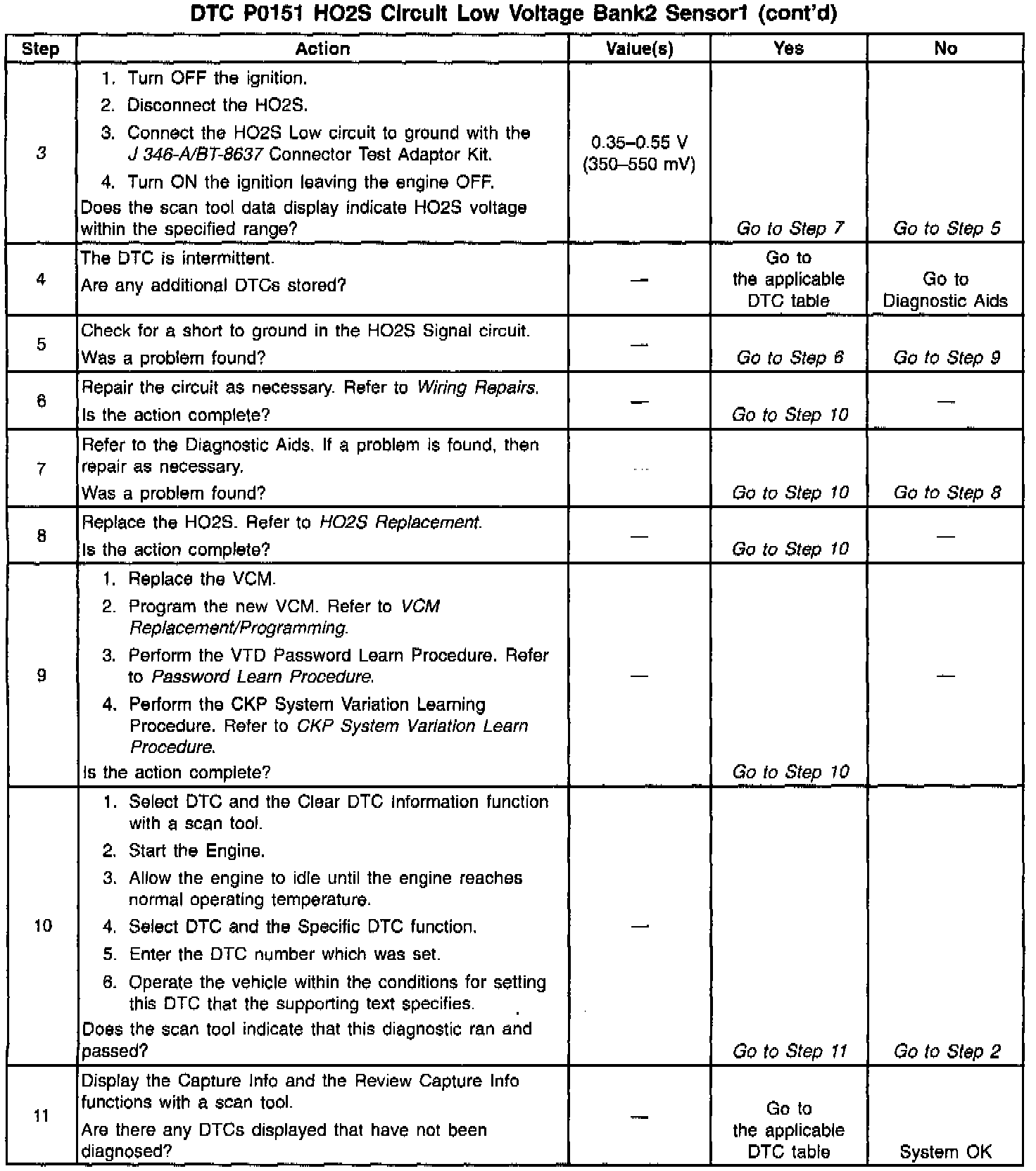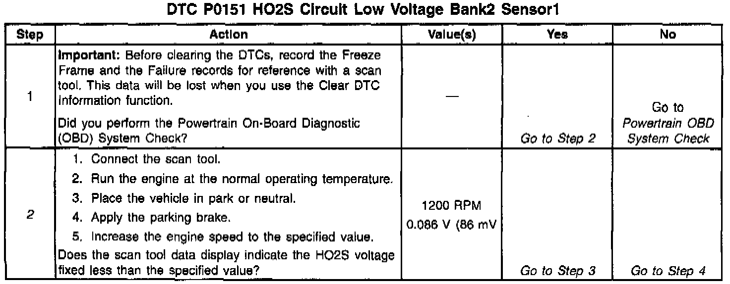 The sensor is like an open circuit and produces no voltage when it is below 360°C (600°F). The DTC P0151, P0152, an open signal circuit, or a cold sensor causes Open Loop operation. The DTC P0151 determines if the HO2S sensor or the signal circuit is shorted to low by checking for a lean condition during a steady throttle and power enrichment (PE).
