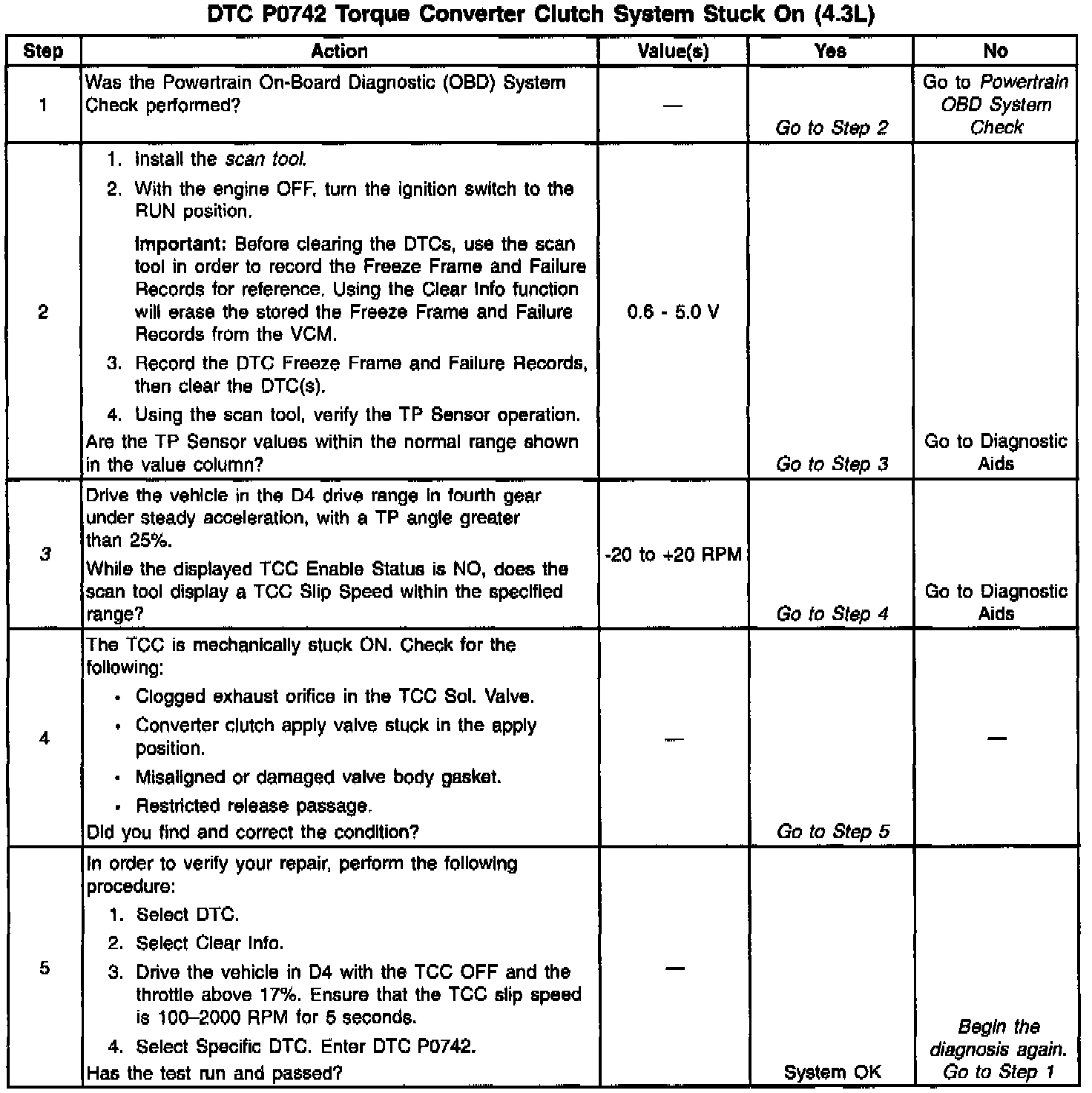 When the VCM detects low torque converter slip when the TCC is commanded OFF, then DTC P0742 sets. DTC P0742 is a type B DTC.