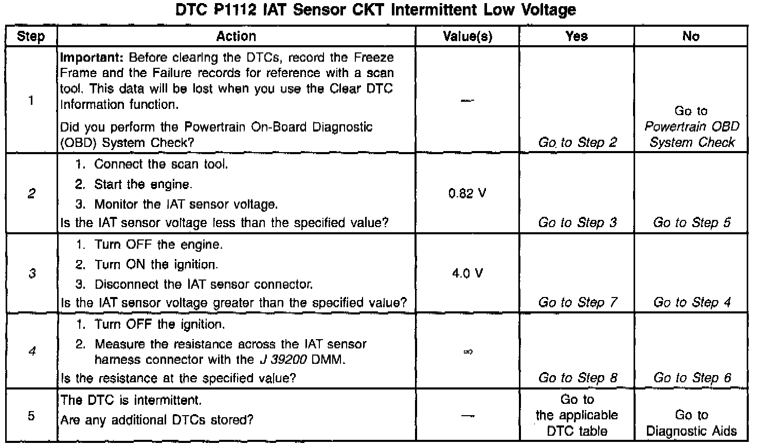 2. If IAT sensor circuit voltage is less than 0.82 volts, then the conditions for the DTC are still present and the problem is not intermittent.