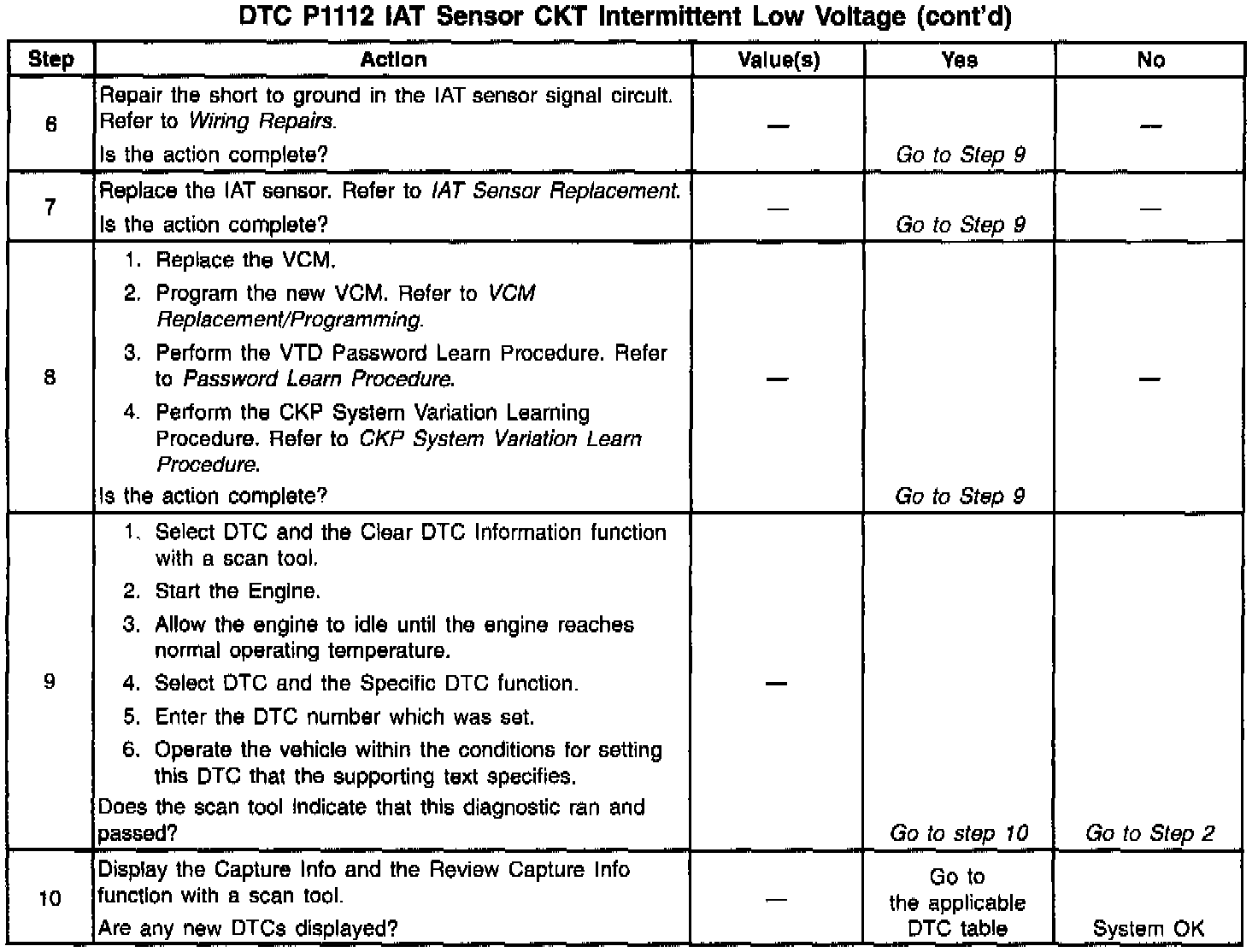 A scan tool indicates the temperature of the ambient air entering the throttle body. The air temperature should read very close to the temperature of the outside air and should rise gradually as the engine warms up and the underhood temperature increases. If DTC P1112 is set, the problem is intermittent. Check for a short to ground in the IAT sensor signal circuit. Accomplish this by moving the VCM harness at various locations and monitoring the IAT temperature or the IAT voltage on the scan tool. If the voltage varies, look for a short to ground in the area of the harness that caused the waiver. Also, a sensor may become skewed or mis-scaled. The Temperature vs. Resistance Value Table will help to detect a skewed sensor. Refer to Specifications / Electrical / Temperature vs Resistance.
