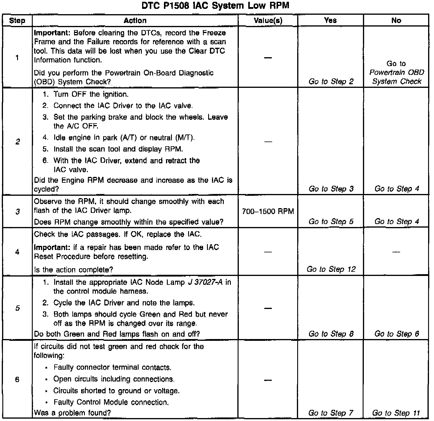 3. This step checks the quality of the IAC movement in Step 2. Between 700 RPM and about 1200 RPM, the engine speed should change smoothly with each flash of the tester lamp in both extend and retract. If the IAC valve is retracted beyond the control range (about 1500 RPM), it may take many flashes in the extend position before engine speed will begin to drop. This is normal on certain engines, fully extending IAC may cause engine stall. This may be normal.