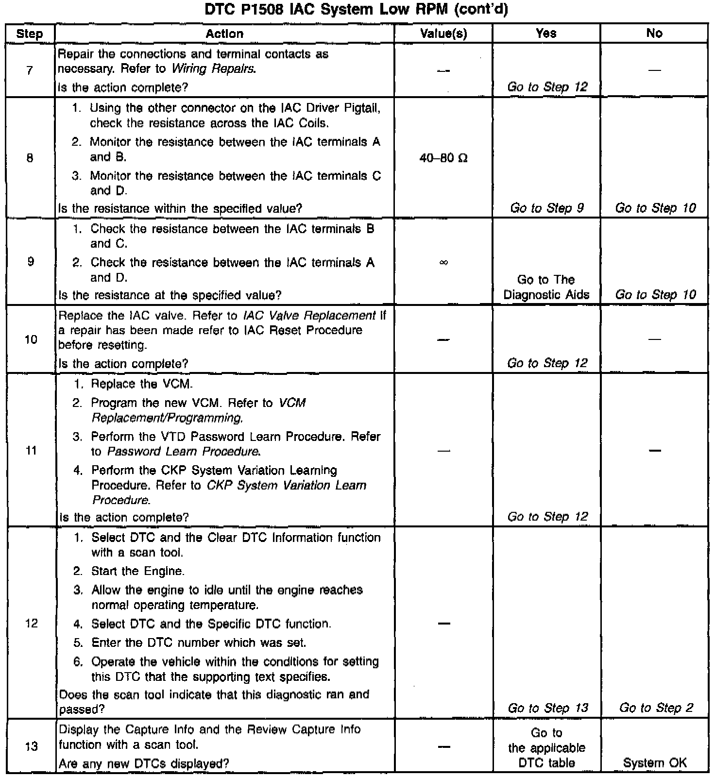 An IAC valve which is stopped and cannot respond to the VCM, a throttle stop screw which has been tampered with, or a damaged throttle or linkage could cause this DTC. A slow, unstable, or fast idle may be caused by a non - IAC valve system problem that cannot be overcome by the IAC valve. Out of range control IAC scan tool counts will be above 60 if idle is too low and zero it idle is too high. Check for the following conditions:
