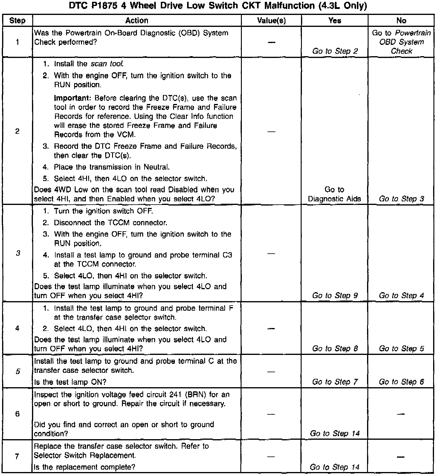 When the VCM detects a continuous open or short to ground in the 4WD low circuit, then DTC P1875 sets. DTC P1875 is a type B DTC.