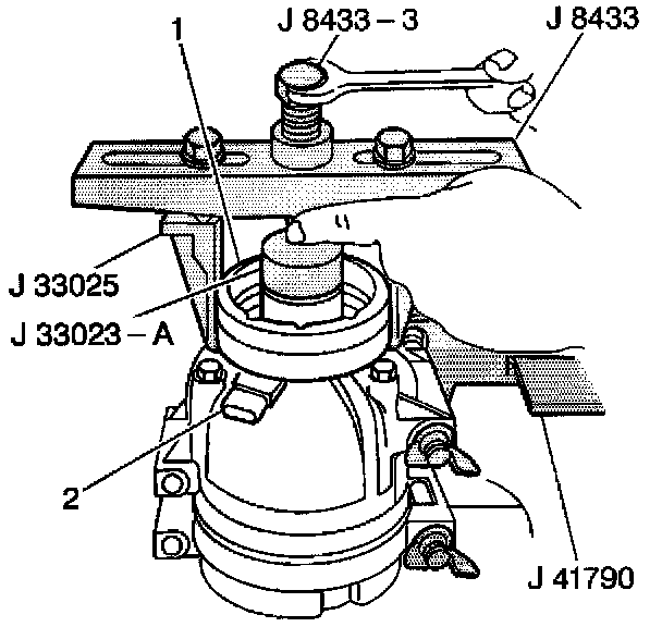 9. Tighten the center forcing screw J 8433-3 of the compressor pulley puller J 8433 against the J 33023-A to remove the compressor clutch coil from the compressor.