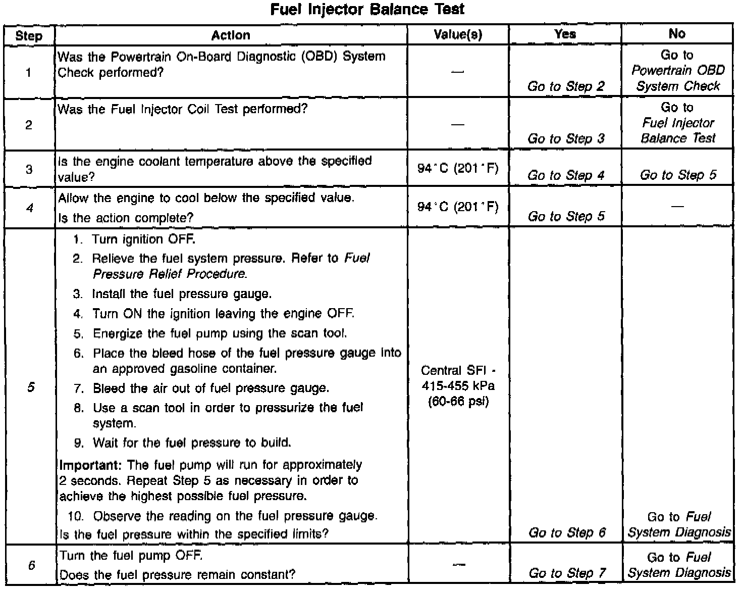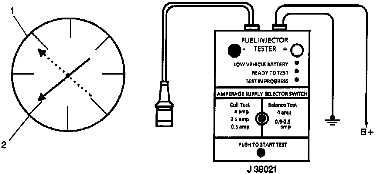 The Fuel Injector Tester J 39021, the Injector Switch Box J 39021-210 and the Injector Harness Connector d 39021-301 energize the injector for a precise amount of time allowing a measured amount of fuel into the manifold. This causes a drop in system fuel pressure that can be recorded and used to compare each injector. All injectors should be within the same pressure drop range, the average pressure drop value for all injectors is ±10 kPa (1.5 psi).