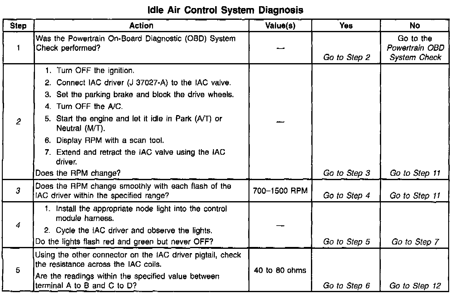 ^ If intermittent poor driveability or idle symptoms are resolved by disconnecting the IAC, carefully recheck connections, valve terminal resistance or replace IAC.