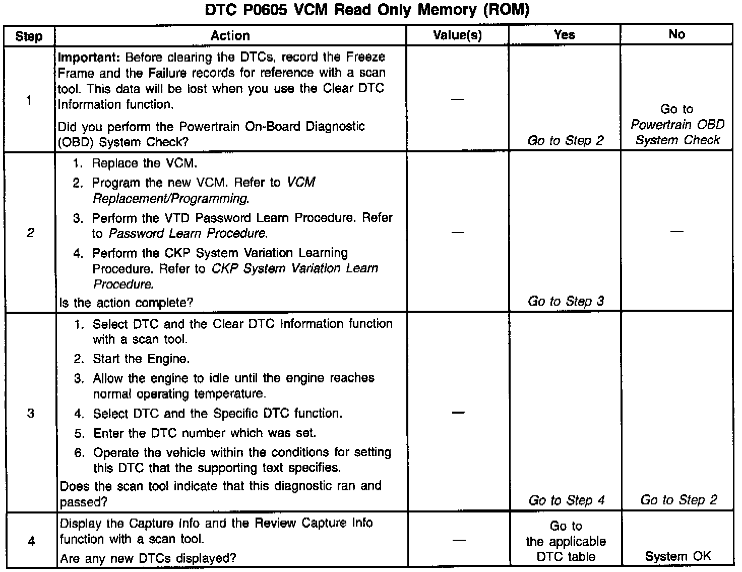 The Vehicle Control Module (VCM) memory contains data which is essential to running the engine and transmission. The VCM checks the integrity of this data. If the checksum of the Boot Flash section of memory does not match a predetermined value, DTC P0605 sets.