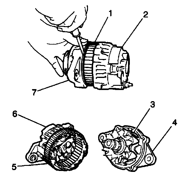 4. Using a flat-bladed tool, gently pry off the front housing (7) (with the drive pulley and rotor) from the stator coil (1) and rear housing (2).