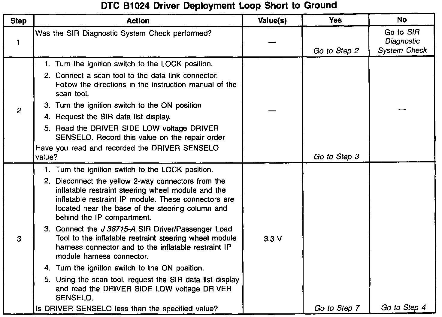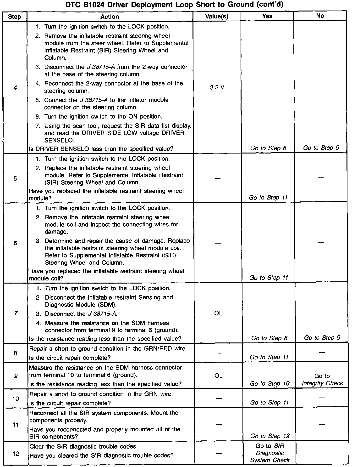 A short-to-ground in the inflatable restraint steering module circuit can cause an intermittent condition. Moving wires while monitoring DRIVER SENSELO may help locate the fault. Inspect the GRN/RED wire and the GRN wire carefully for cut or chafed wires. The diagnostic table directs the technician to note the entry value of DRIVER SENSELO can be helpful in determining if an intermittent condition exists.