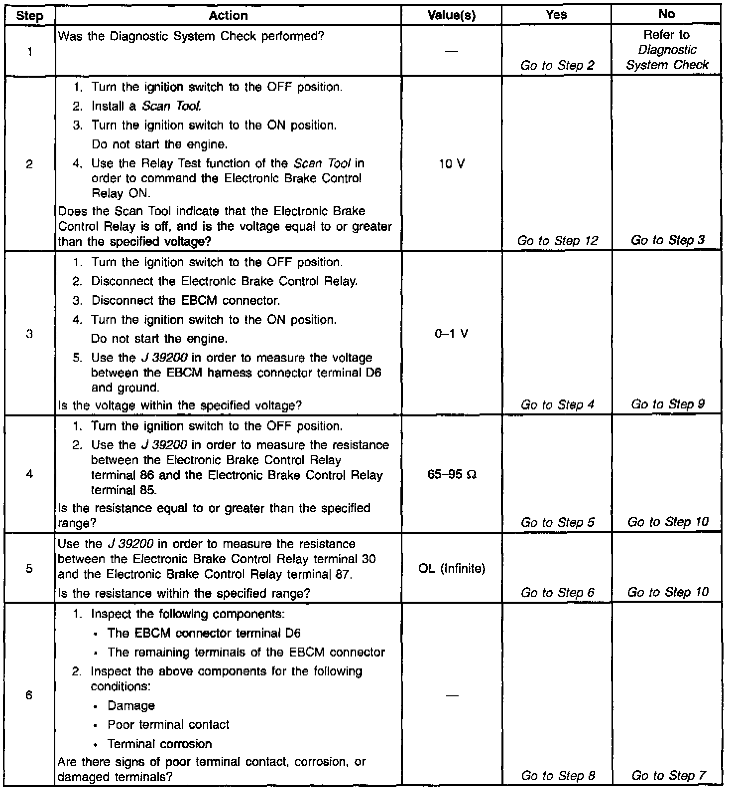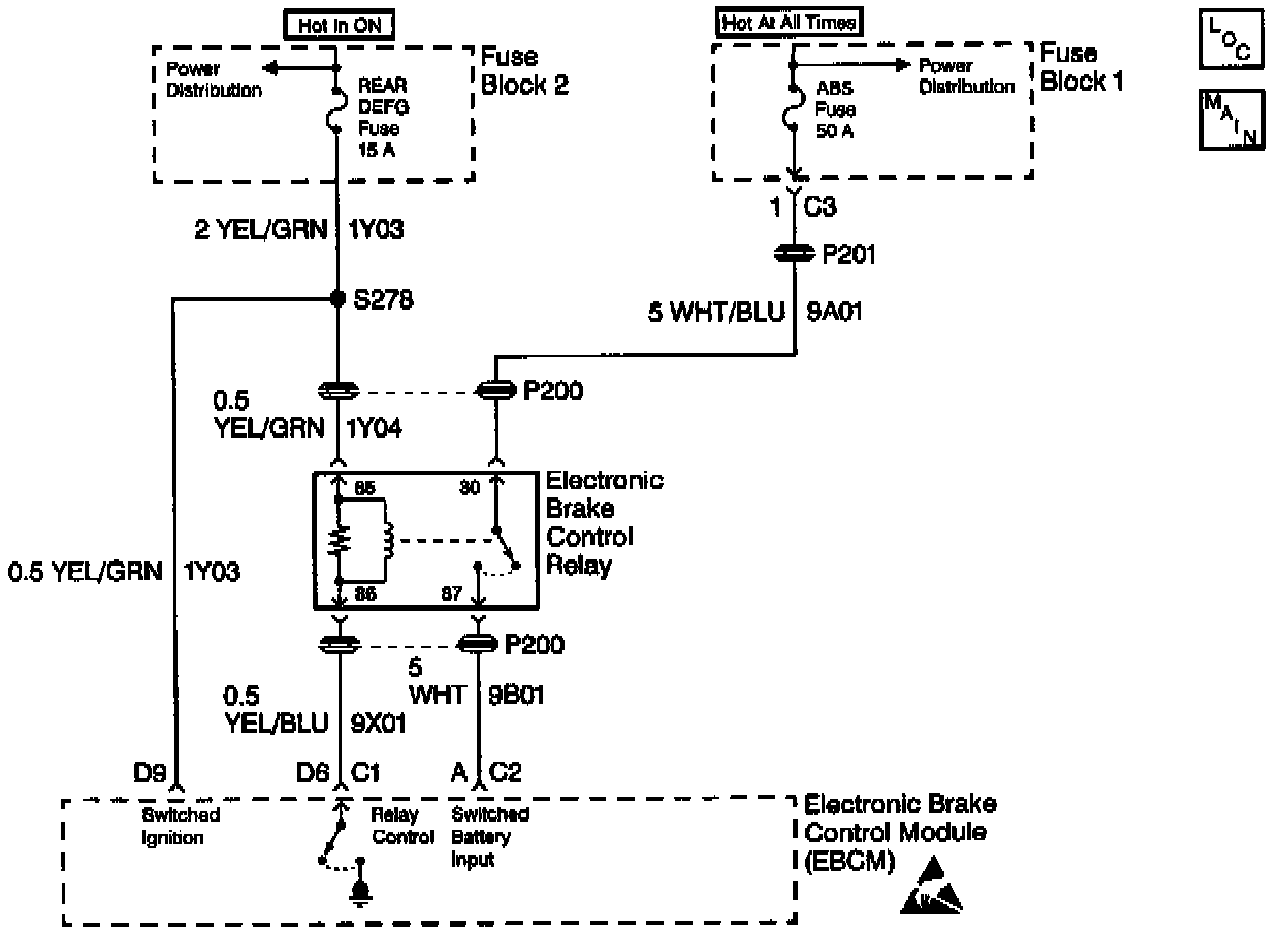 Ignition voltage is supplied to terminal 85 of the electronic brake control relay. The EBCM is then able to energize the pull-in coil by completing the ground circuit at Electronic Brake Control Module (EBCM) connector C1 terminal D6.The magnetic field created closes the relay contacts and allows battery voltage and current to be supplied to the EBCM. In addition, the EBCM supplies power to the motors and the Antilock Brake System (ABS) solenoids.