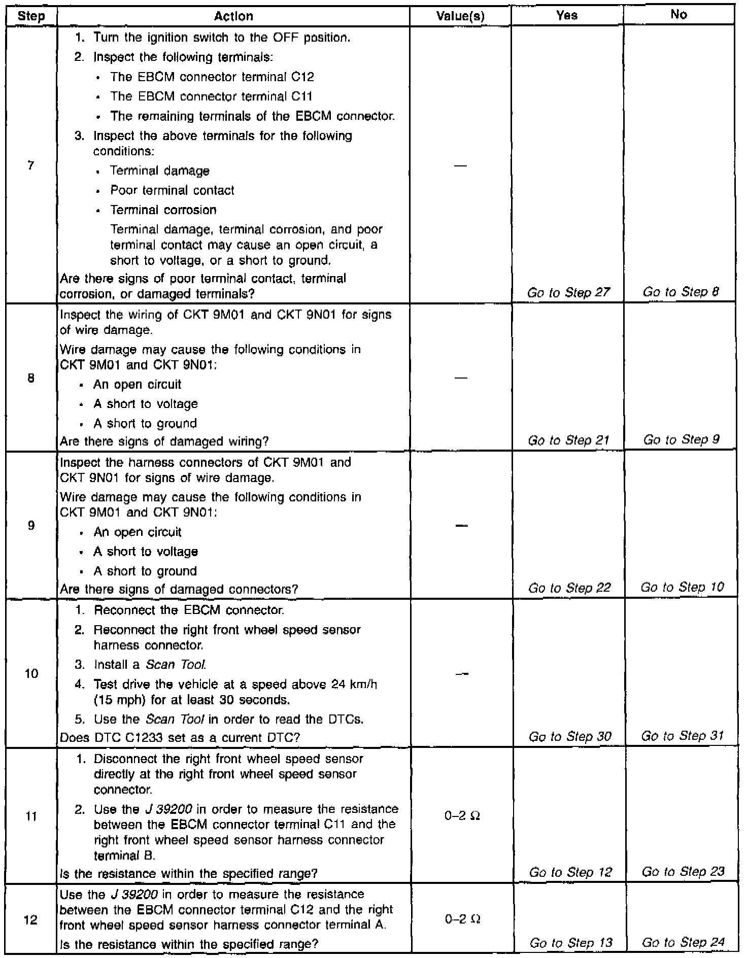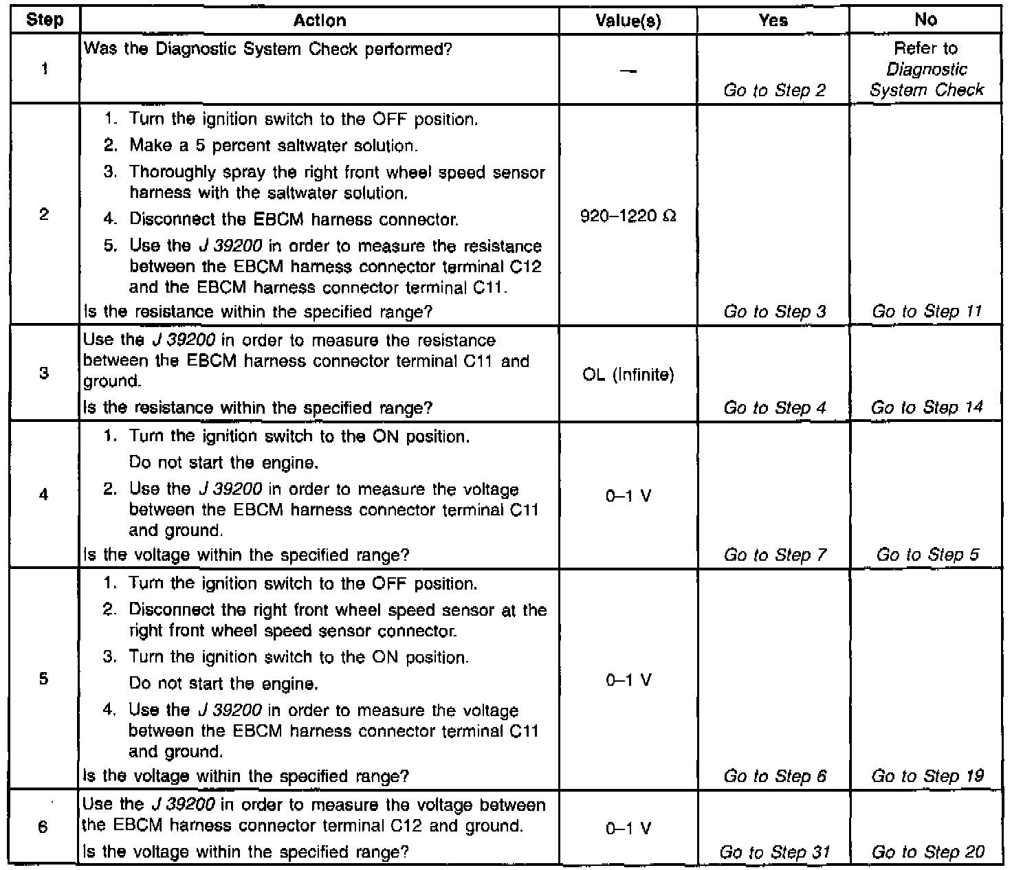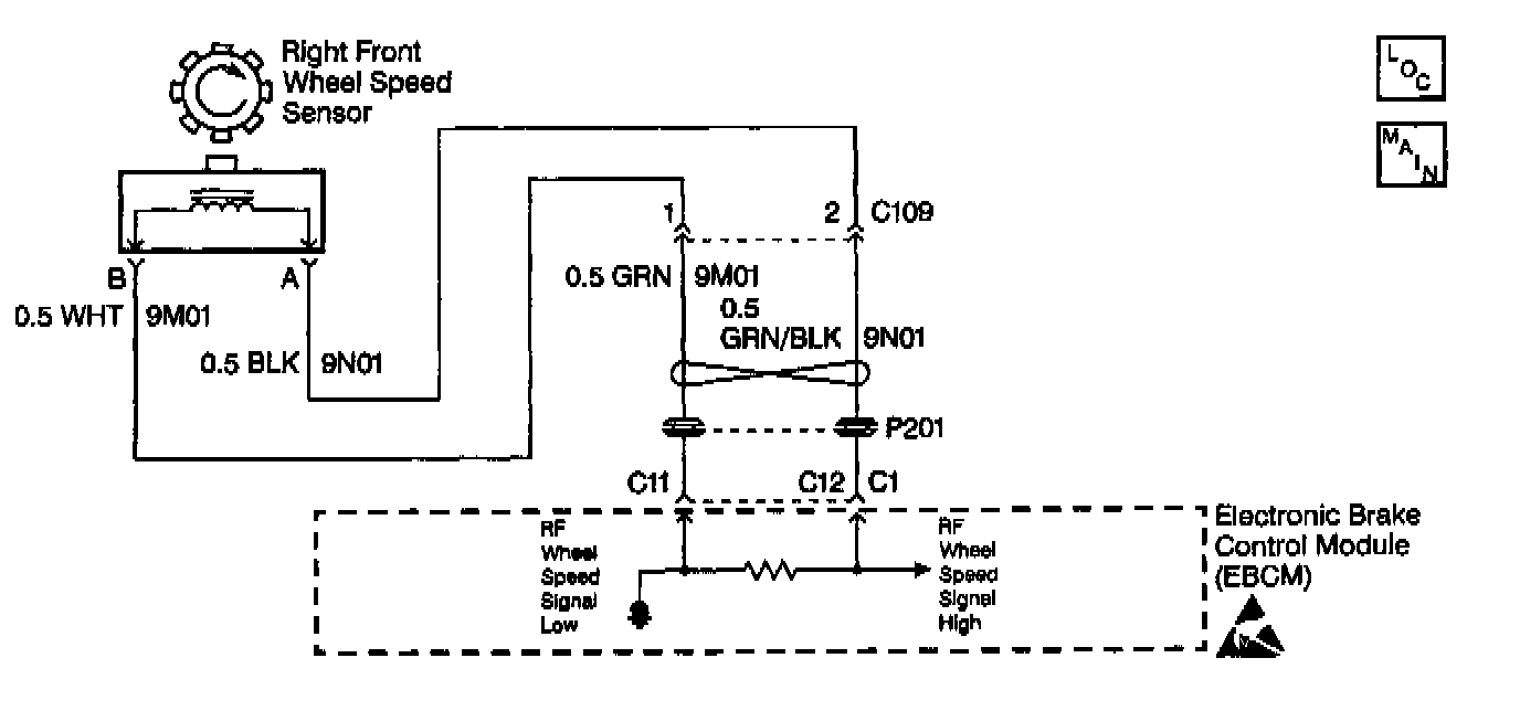 A malfunction exists if either of the right front wheel speed sensor circuits are open or shorted to voltage or ground.